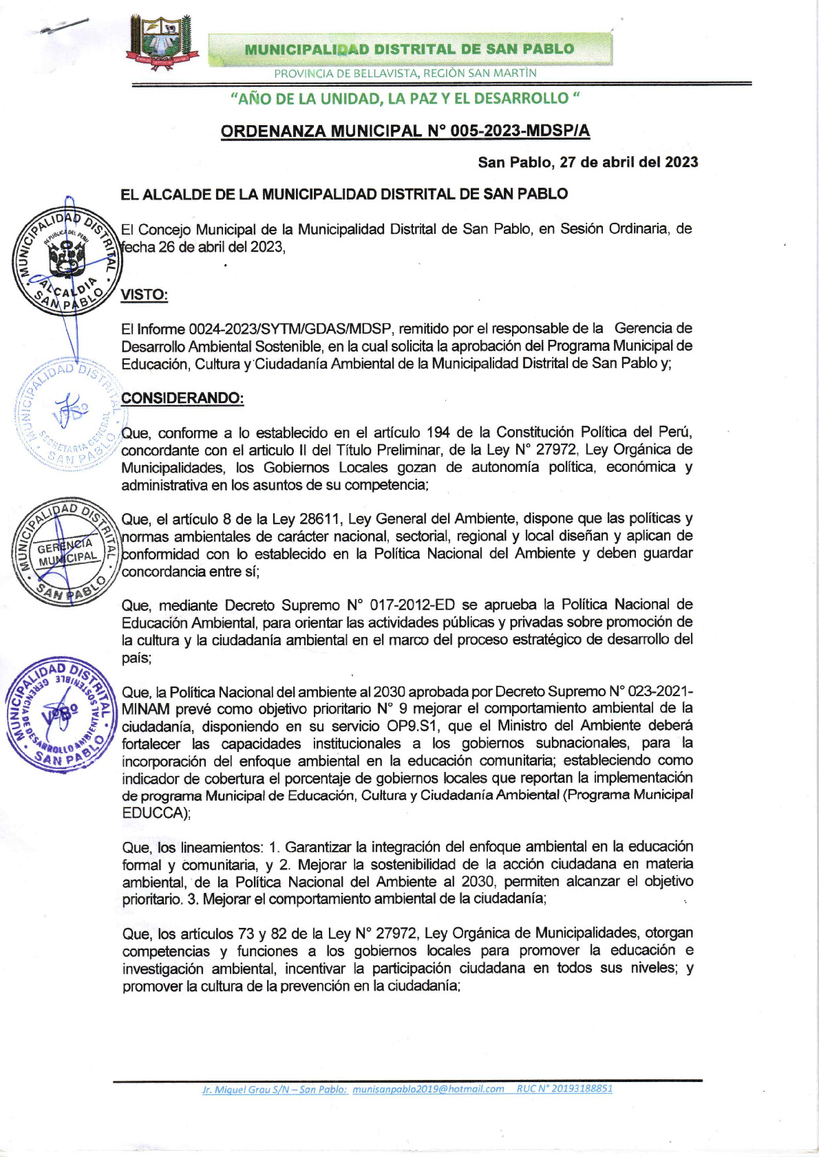 La presente Ordenanza aprueba el Programa Municipal de Educación, Cultura y Ciudadanía Ambiental de la Municipalidad Distrital de San Pablo - Bellavista (San Martín), con la finalidad de promover la cultura y la educación ambiental para la formación de ciudadanas y ciudadanos ambientalmente responsables e incentivar la participación ciudadana en todos sus niveles.