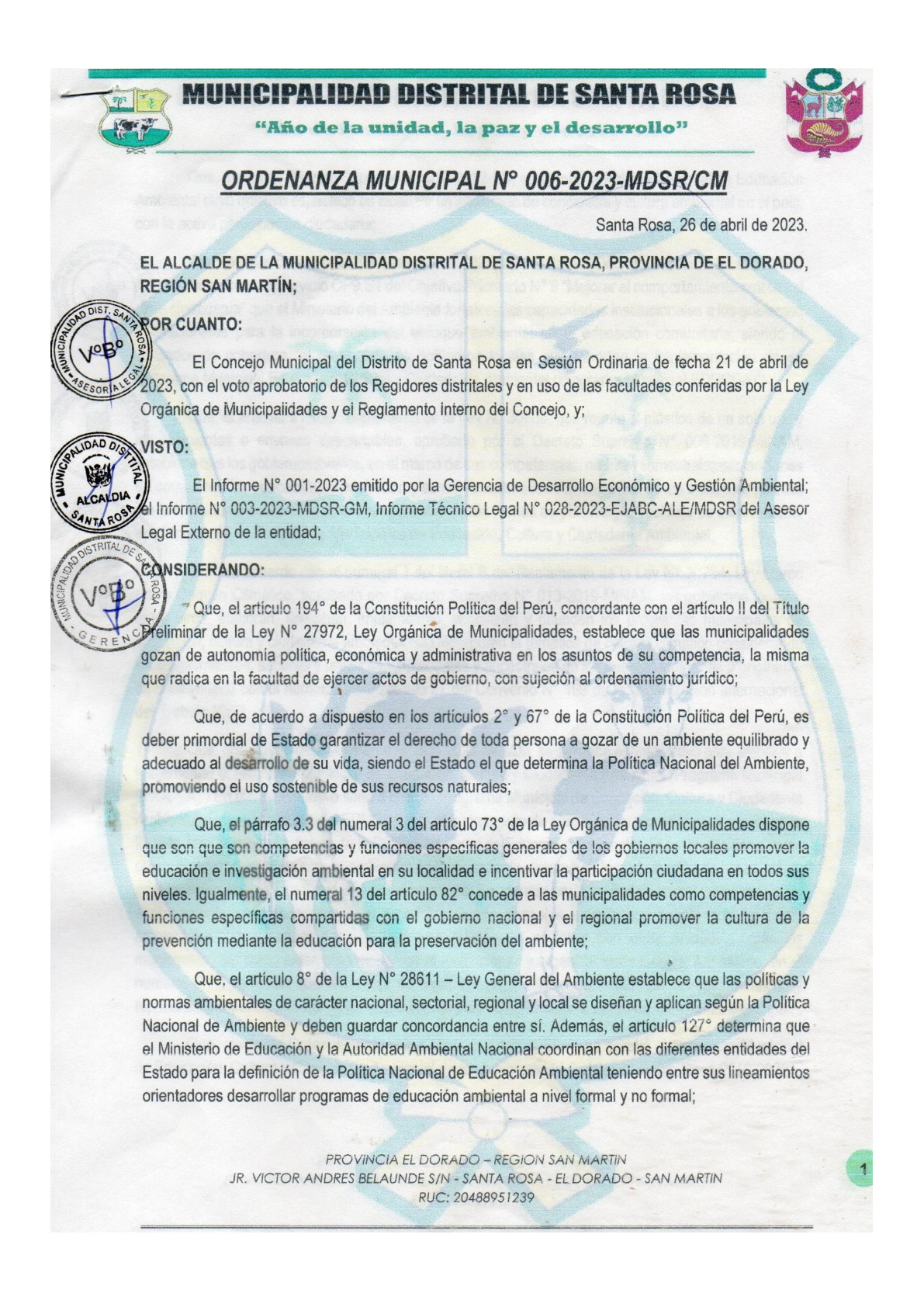La presente Ordenanza aprueba el Programa Municipal de Educación, Cultura y Ciudadanía Ambiental de la Municipalidad Distrital de Santa Rosa - El Dorado (San Martín), con la finalidad de promover la cultura y la educación ambiental para la formación de ciudadanas y ciudadanos ambientalmente responsables e incentivar la participación ciudadana en todos sus niveles.