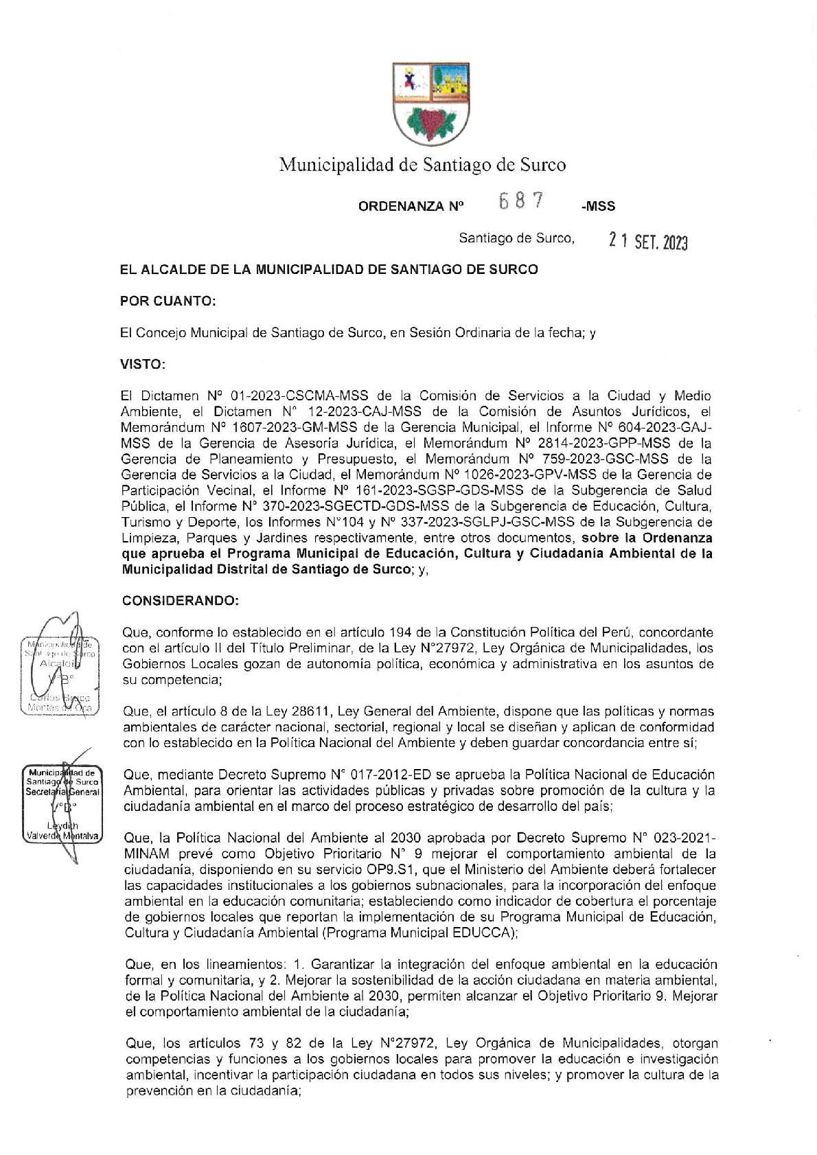 La presente Ordenanza aprueba el Programa Municipal de Educación, Cultura y Ciudadanía Ambiental de la Municipalidad Distrital de Santiago de Surco - Lima (Lima Metropolitana), con la finalidad de promover la cultura y la educación ambiental para la formación de ciudadanas y ciudadanos ambientalmente responsables e incentivar la participación ciudadana en todos sus niveles.