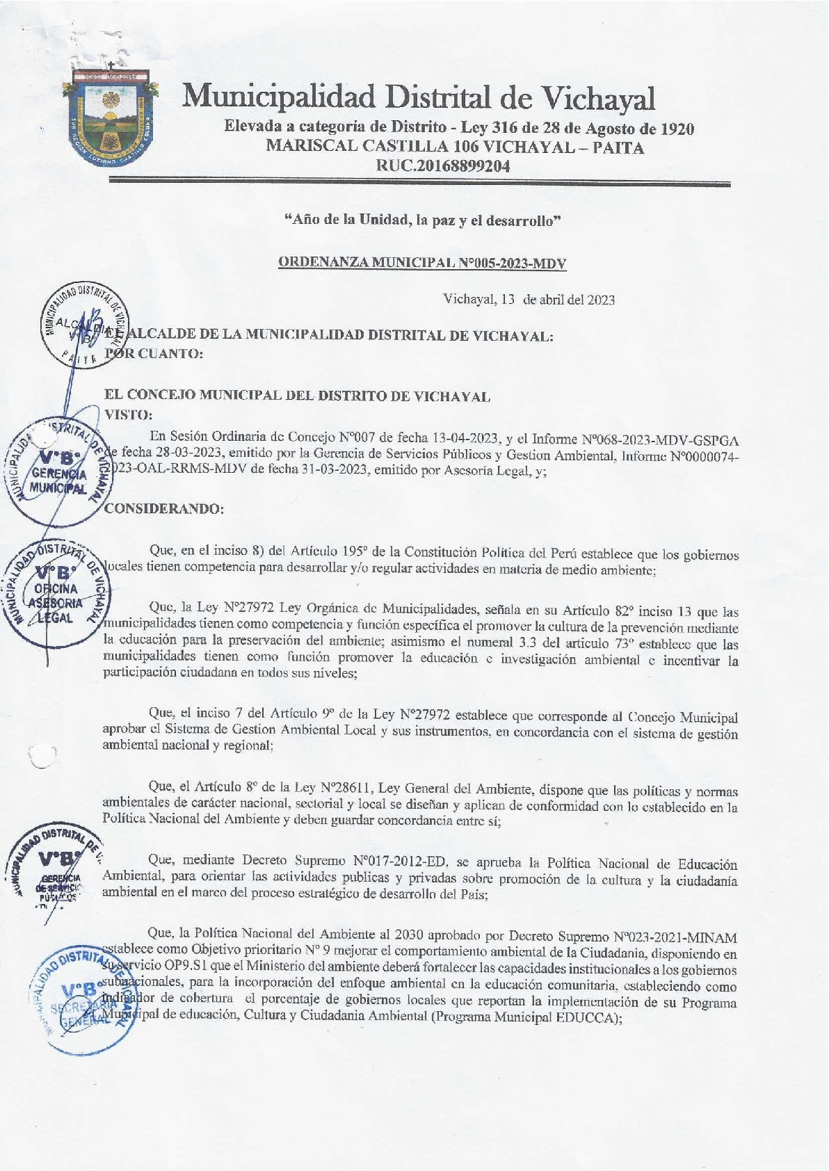 La presente Ordenanza aprueba el Programa Municipal de Educación, Cultura y Ciudadanía Ambiental de la Municipalidad Distrital de Vichayal - Paita (Piura), con la finalidad de promover la cultura y la educación ambiental para la formación de ciudadanas y ciudadanos ambientalmente responsables e incentivar la participación ciudadana en todos sus niveles.