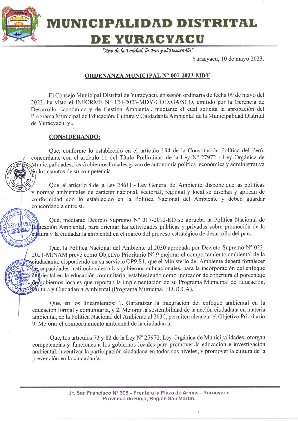 La presente Ordenanza aprueba el Programa Municipal de Educación, Cultura y Ciudadanía Ambiental de la Municipalidad Distrital de Yuracyacu - Rioja (San Martín), con la finalidad de promover la cultura y la educación ambiental para la formación de ciudadanas y ciudadanos ambientalmente responsables e incentivar la participación ciudadana en todos sus niveles.