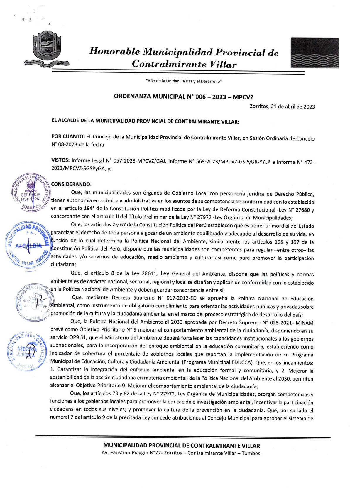 Programa Municipal de Educación, Cultura y Ciudadanía Ambiental de la Municipalidad Provincial de Contralmirante Villar