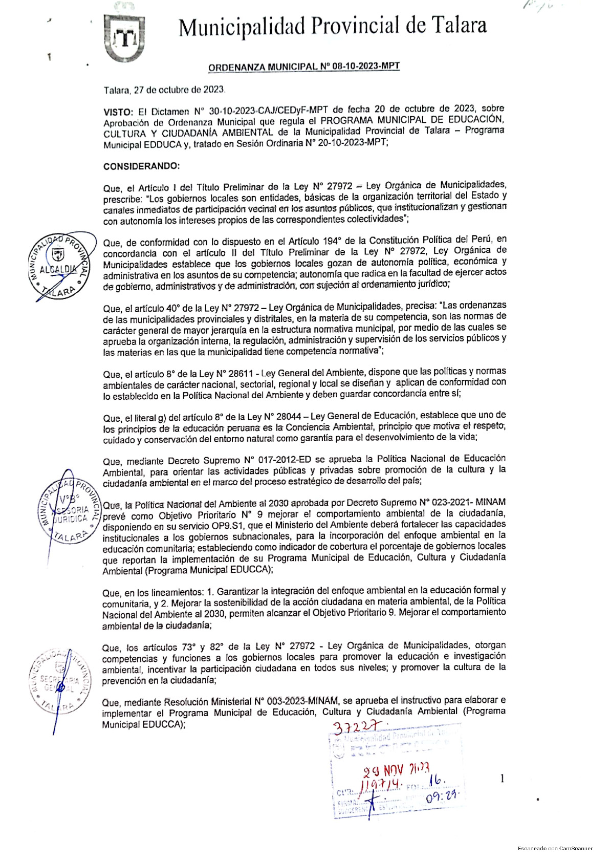 La presente Ordenanza aprueba el Programa Municipal de Educación, Cultura y Ciudadanía Ambiental de la Municipalidad Provincial de Talara - Talara (Piura), con la finalidad de promover la cultura y la educación ambiental para la formación de ciudadanas y ciudadanos ambientalmente responsables e incentivar la participación ciudadana en todos sus niveles.
