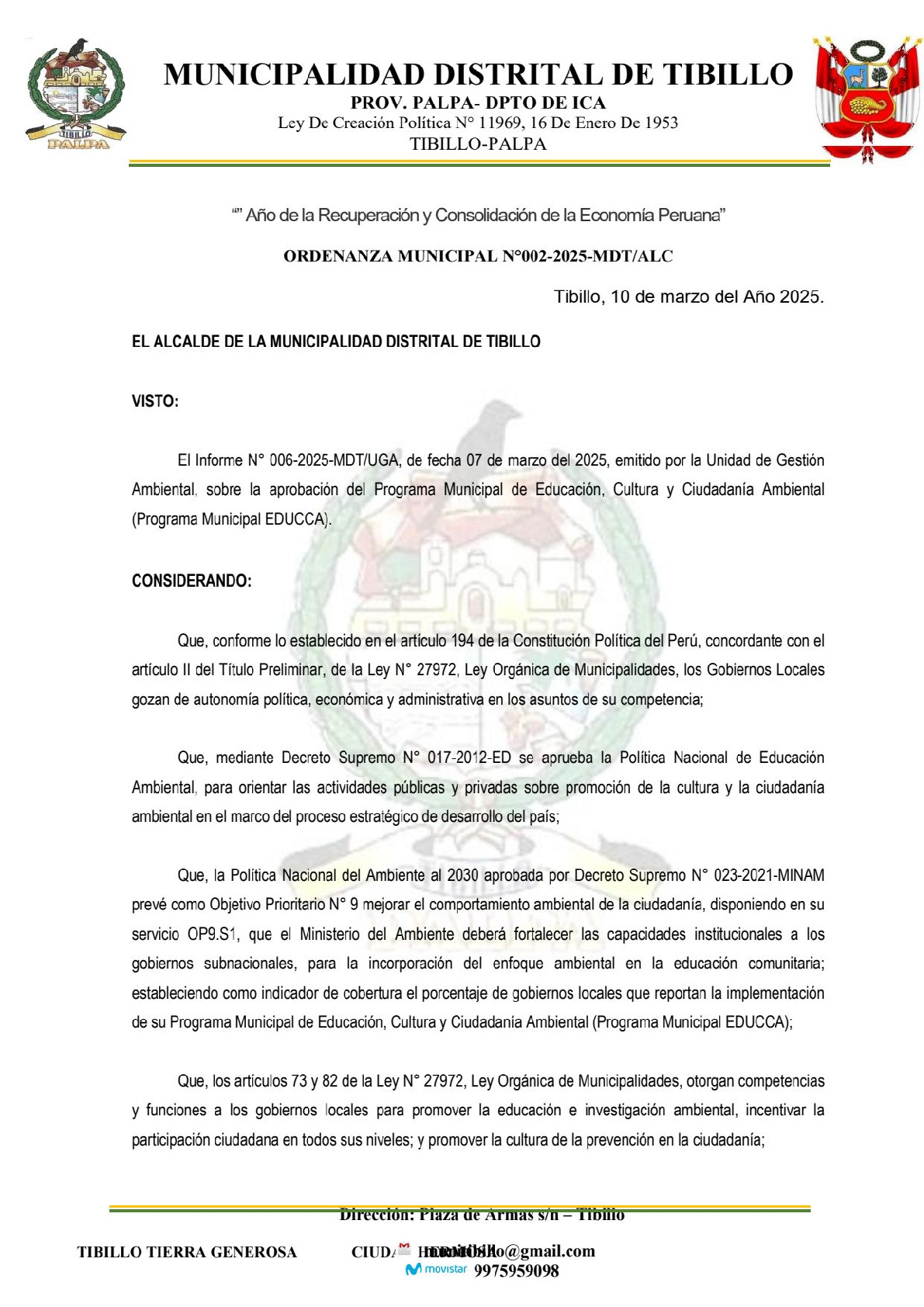 La presente Ordenanza aprueba el Programa Municipal de Educación, Cultura y Ciudadanía Ambiental de la Municipalidad Distrital de Tibillo - Palpa (Ica), con la finalidad de promover la cultura y la educación ambiental para la formación de ciudadanas y ciudadanos ambientalmente responsables e incentivar la participación ciudadana en todos sus niveles.