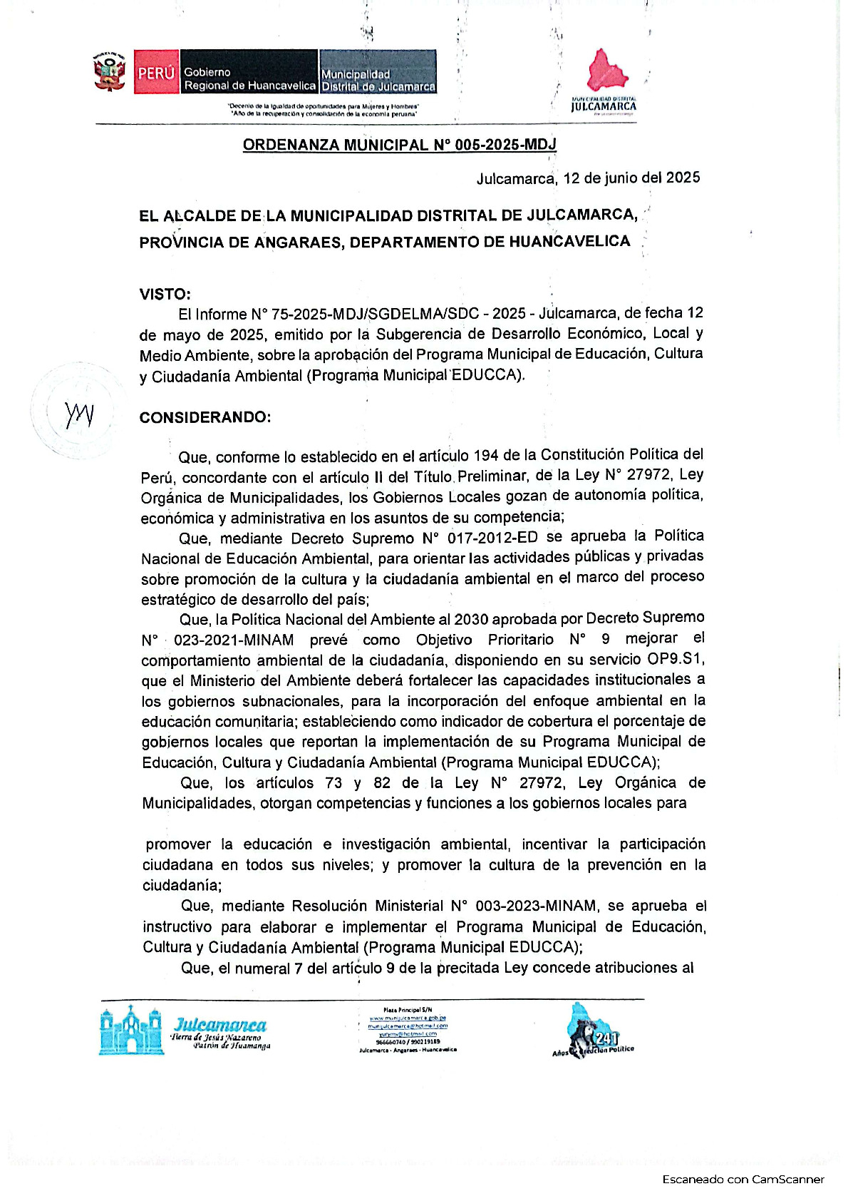 La presente Ordenanza aprueba el Programa Municipal de Educación, Cultura y Ciudadanía Ambiental de la Municipalidad Distrital de Julcamarca - Angaraes (Huancavelica), con la finalidad de promover la cultura y la educación ambiental para la formación de ciudadanas y ciudadanos ambientalmente responsables e incentivar la participación ciudadana en todos sus niveles.