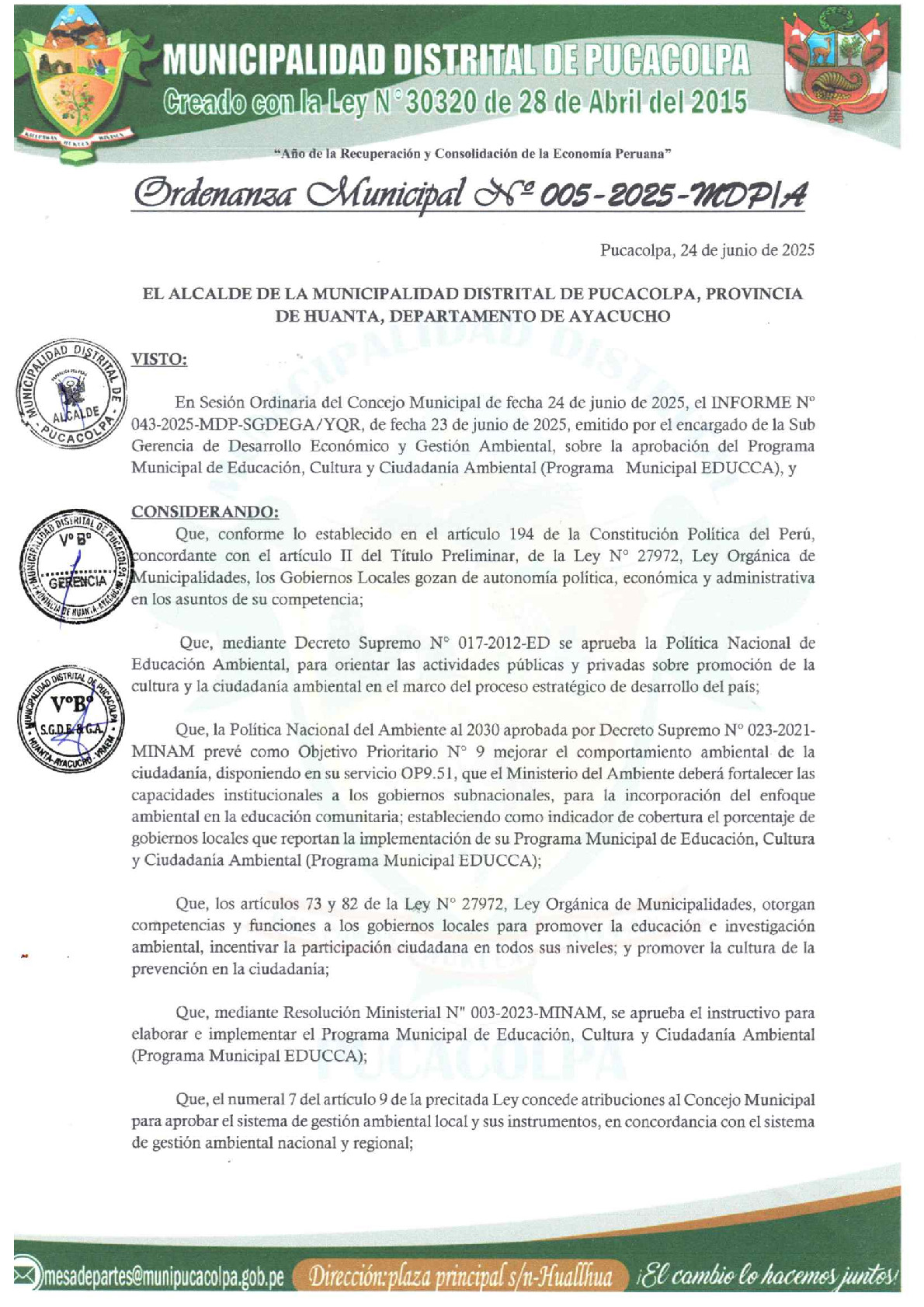 La presente Ordenanza aprueba el Programa Municipal de Educación, Cultura y Ciudadanía Ambiental de la Municipalidad Distrital de Pucacolpa - Huanta (Ayacucho), con la finalidad de promover la cultura y la educación ambiental para la formación de ciudadanas y ciudadanos ambientalmente responsables e incentivar la participación ciudadana en todos sus niveles.