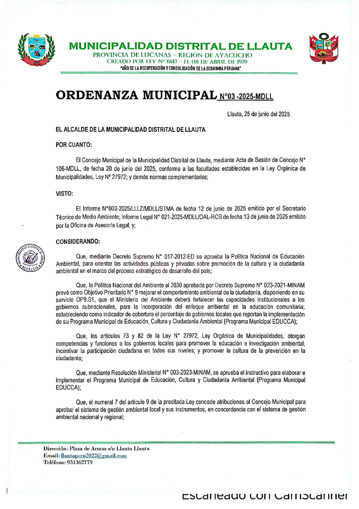 La presente Ordenanza aprueba el Programa Municipal de Educación, Cultura y Ciudadanía Ambiental de la Municipalidad Distrital de Llauta - Lucanas (Ayacucho), con la finalidad de promover la cultura y la educación ambiental para la formación de ciudadanas y ciudadanos ambientalmente responsables e incentivar la participación ciudadana en todos sus niveles.