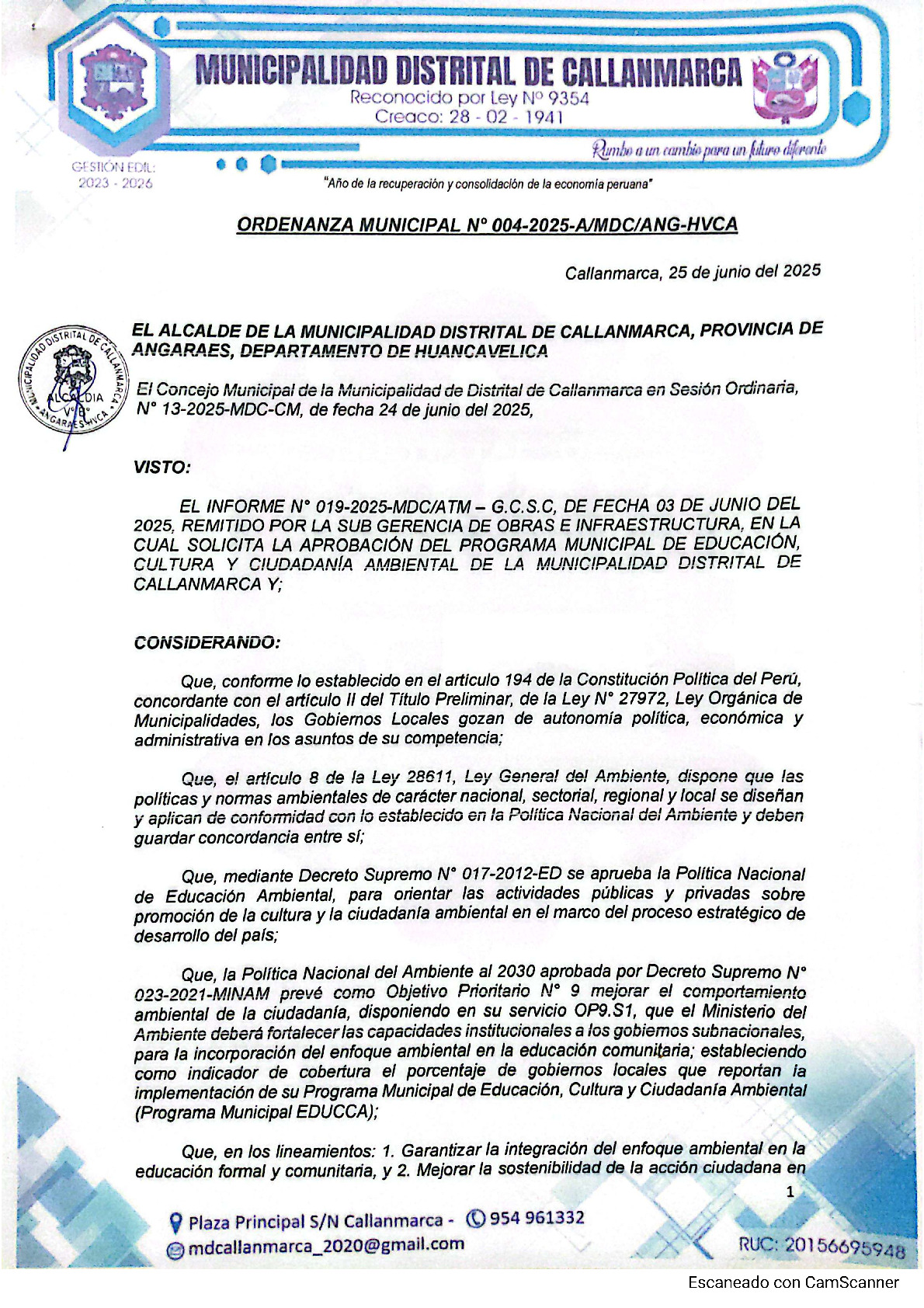 La presente Ordenanza aprueba el Programa Municipal de Educación, Cultura y Ciudadanía Ambiental de la Municipalidad Distrital de Callanmarca - Angaraes (Huancavelica), con la finalidad de promover la cultura y la educación ambiental para la formación de ciudadanas y ciudadanos ambientalmente responsables e incentivar la participación ciudadana en todos sus niveles.