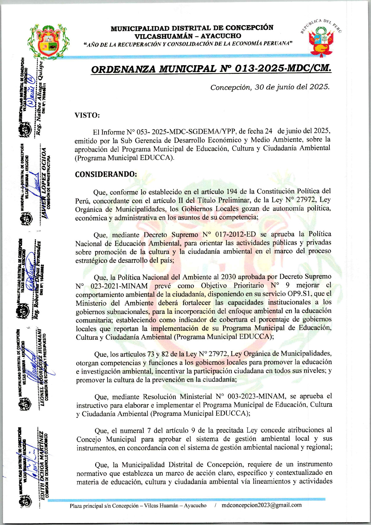 La presente Ordenanza aprueba el Programa Municipal de Educación, Cultura y Ciudadanía Ambiental de la Municipalidad Distrital de Concepción - Vilcas Huamán (Ayacucho), con la finalidad de promover la cultura y la educación ambiental para la formación de ciudadanas y ciudadanos ambientalmente responsables e incentivar la participación ciudadana en todos sus niveles.