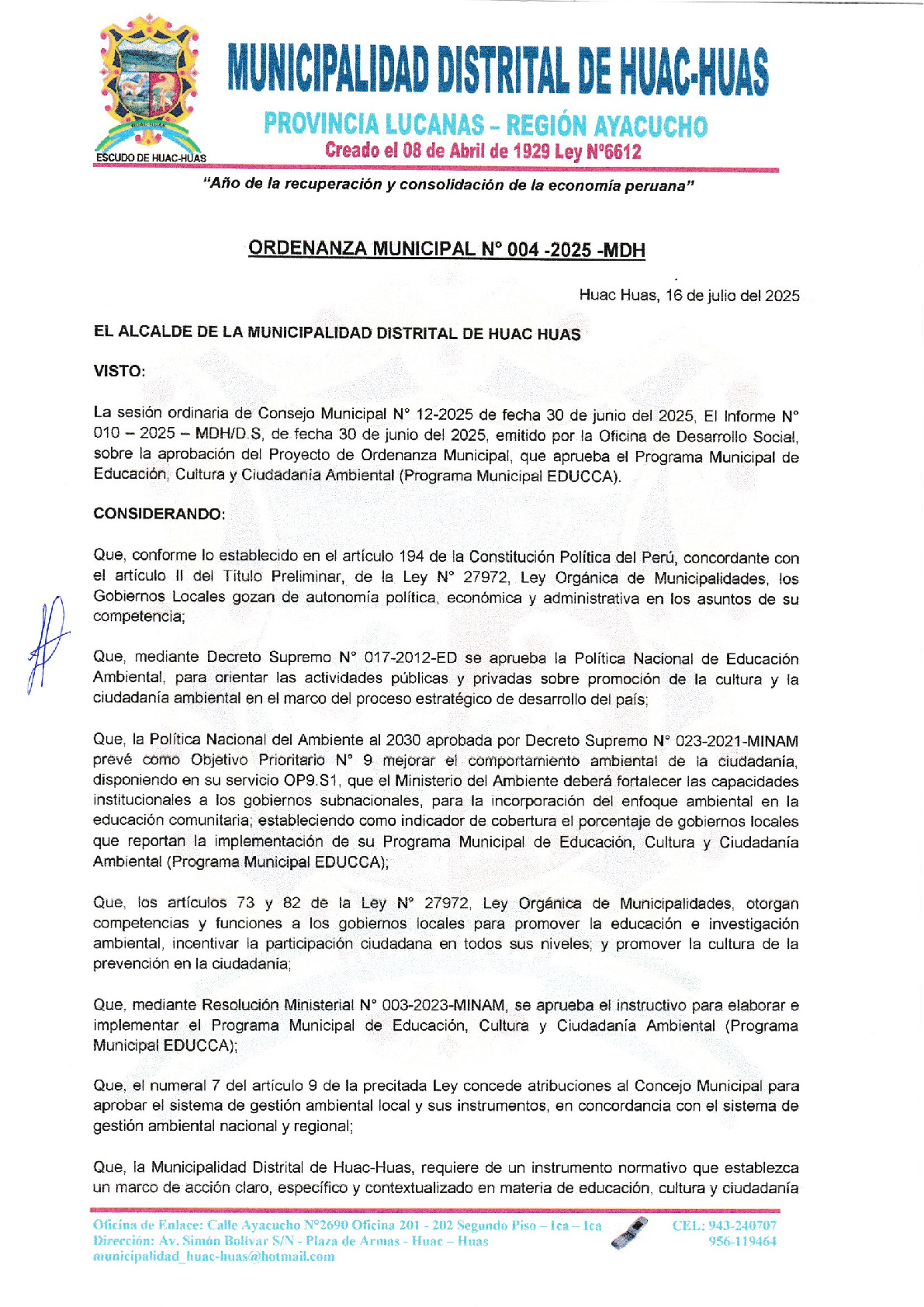 La presente Ordenanza aprueba el Programa Municipal de Educación, Cultura y Ciudadanía Ambiental de la Municipalidad Distrital de Huac-Huas - Lucanas (Ayacucho), con la finalidad de promover la cultura y la educación ambiental para la formación de ciudadanas y ciudadanos ambientalmente responsables e incentivar la participación ciudadana en todos sus niveles.