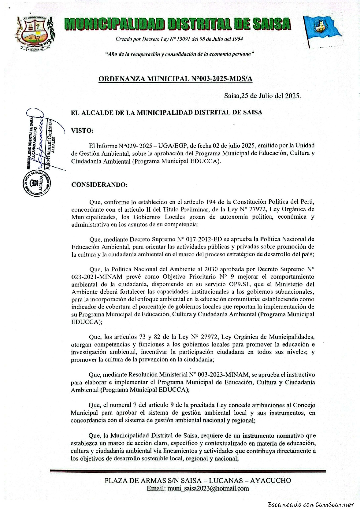 La presente Ordenanza aprueba el Programa Municipal de Educación, Cultura y Ciudadanía Ambiental de la Municipalidad Distrital de Saisa - Lucanas (Ayacucho), con la finalidad de promover la cultura y la educación ambiental para la formación de ciudadanas y ciudadanos ambientalmente responsables e incentivar la participación ciudadana en todos sus niveles.