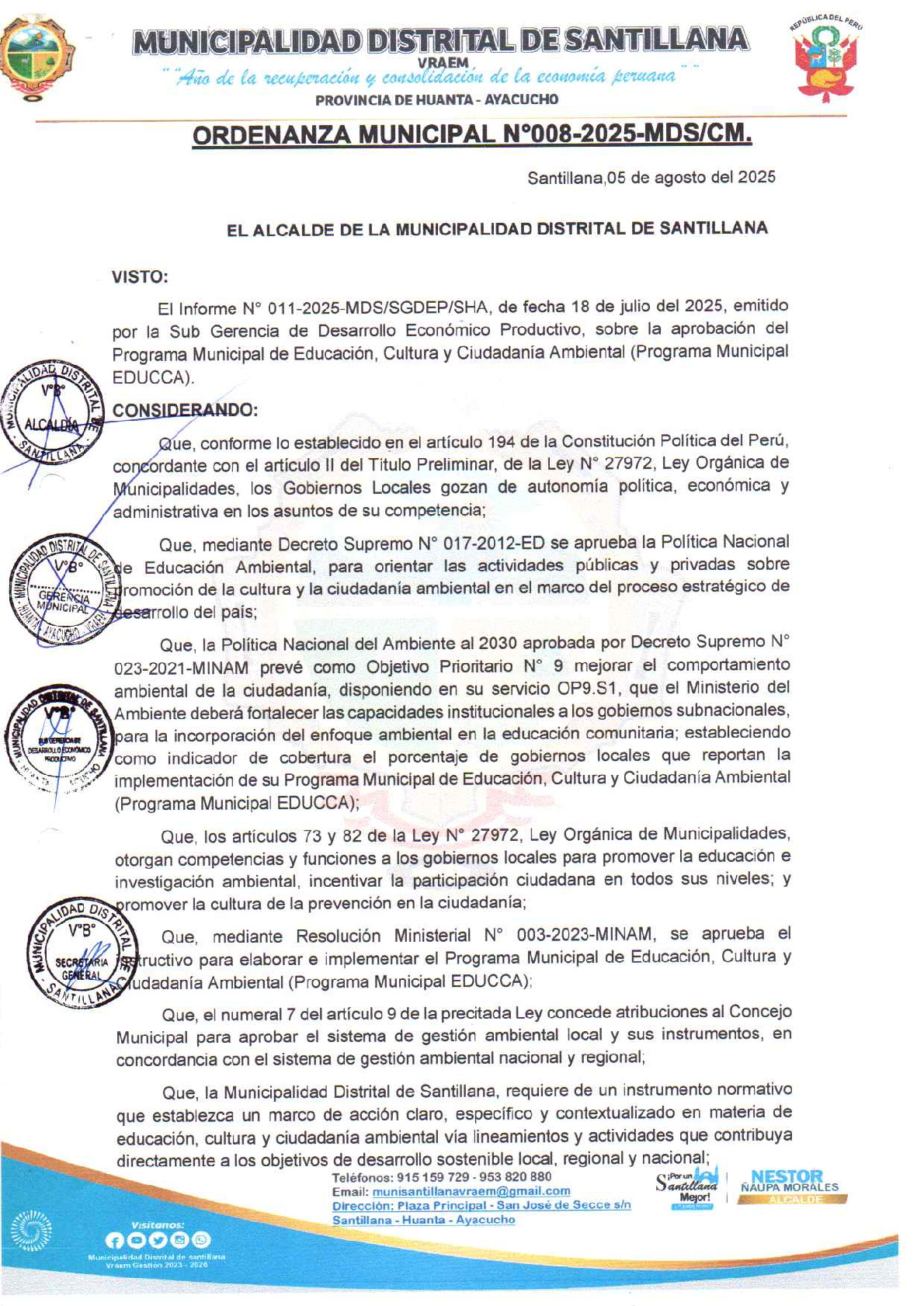 La presente Ordenanza aprueba el Programa Municipal de Educación, Cultura y Ciudadanía Ambiental de la Municipalidad Distrital de Santillana - Huanta (Ayacucho), con la finalidad de promover la cultura y la educación ambiental para la formación de ciudadanas y ciudadanos ambientalmente responsables e incentivar la participación ciudadana en todos sus niveles.