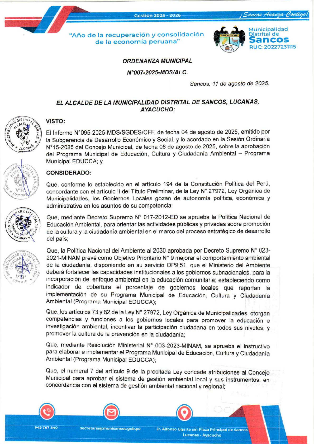 La presente Ordenanza aprueba el Programa Municipal de Educación, Cultura y Ciudadanía Ambiental de la Municipalidad Distrital de Sancos - Lucanas (Ayacucho), con la finalidad de promover la cultura y la educación ambiental para la formación de ciudadanas y ciudadanos ambientalmente responsables e incentivar la participación ciudadana en todos sus niveles.