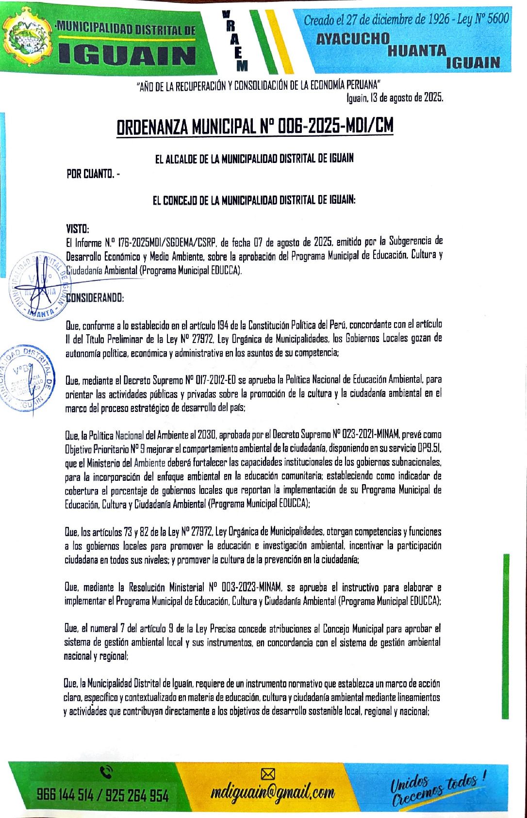 La presente Ordenanza aprueba el Programa Municipal de Educación, Cultura y Ciudadanía Ambiental de la Municipalidad Distrital de Iguain - Huanta (Ayacucho), con la finalidad de promover la cultura y la educación ambiental para la formación de ciudadanas y ciudadanos ambientalmente responsables e incentivar la participación ciudadana en todos sus niveles.