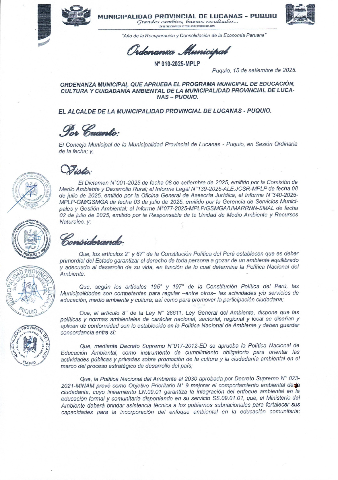 La presente Ordenanza aprueba el Programa Municipal de Educación, Cultura y Ciudadanía Ambiental de la Municipalidad Provincial de Lucanas - Lucanas (Ayacucho), con la finalidad de promover la cultura y la educación ambiental para la formación de ciudadanas y ciudadanos ambientalmente responsables e incentivar la participación ciudadana en todos sus niveles.