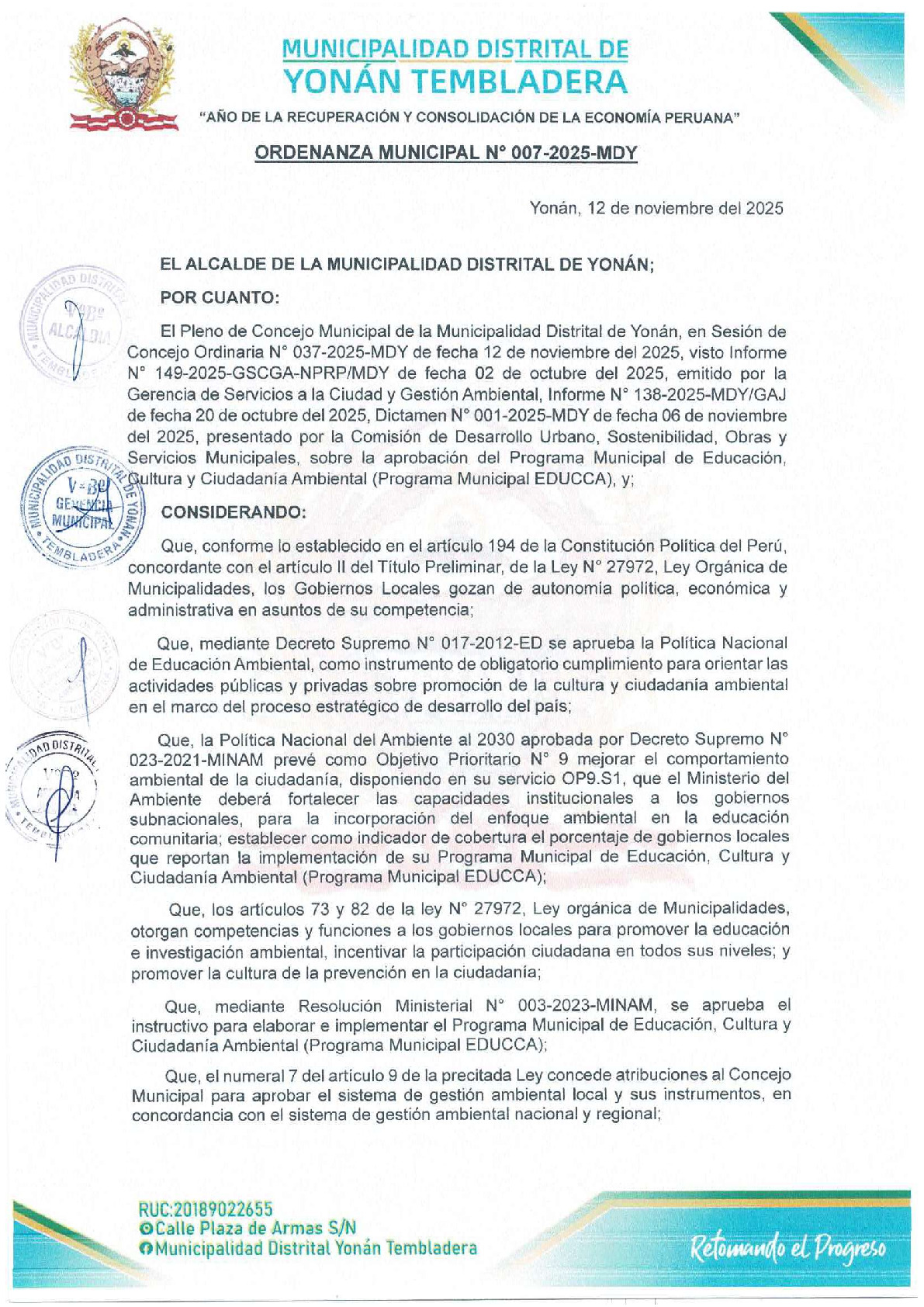 La presente Ordenanza aprueba el Programa Municipal de Educación, Cultura y Ciudadanía Ambiental de la Municipalidad Distrital de Yonán - Contumazá (Cajamarca), con la finalidad de promover la cultura y la educación ambiental para la formación de ciudadanas y ciudadanos ambientalmente responsables e incentivar la participación ciudadana en todos sus niveles.