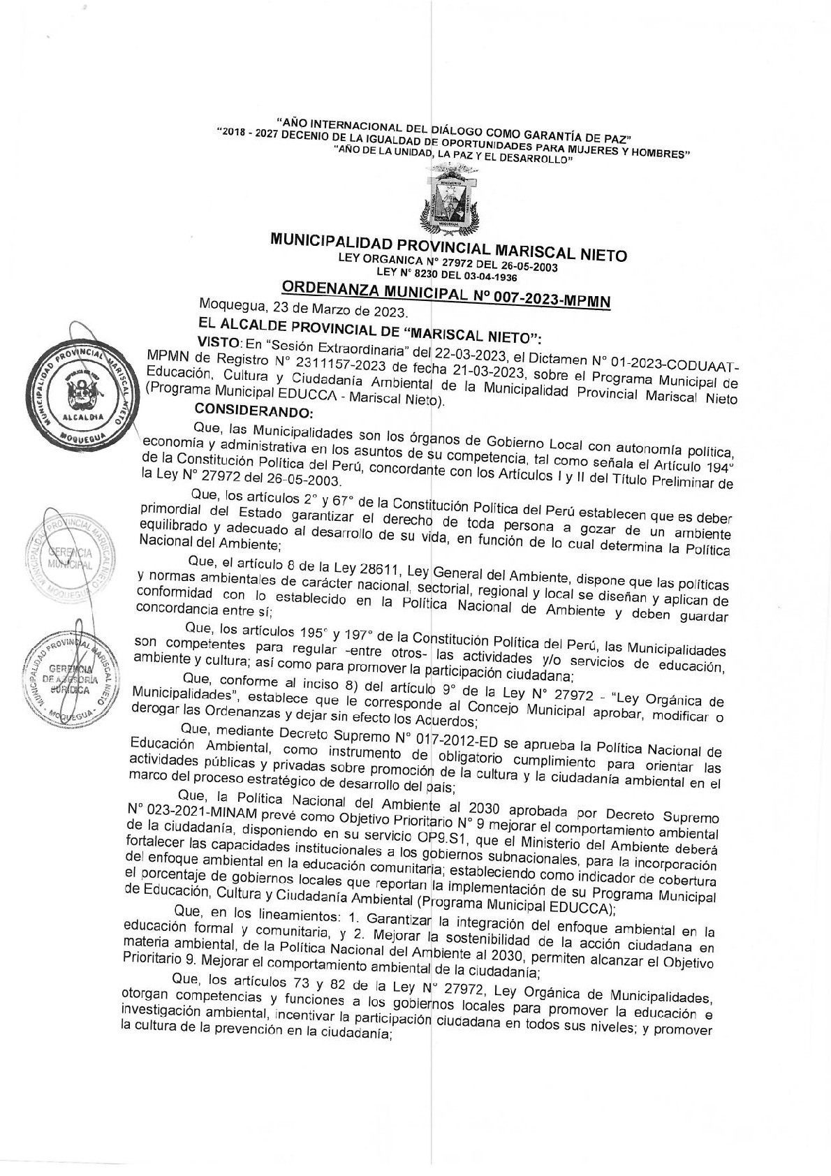 La Ordenanza Municipal que aprueba el Programa Municipal EDUCCA es el instrumento de gestión ambiental que regular los lineamientos de la educcacion ambiental en el ambito del Distrito de Moquegua