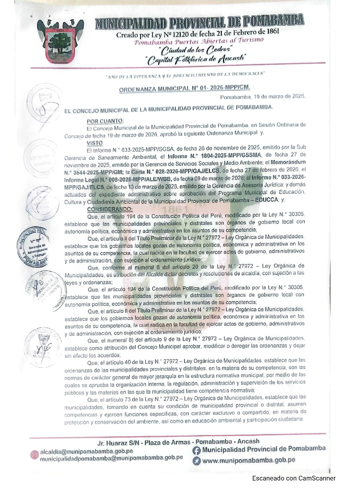 La Municipalidad Provincial de Pomabamba aprobó mediante Ordenanza Municipal N° 01-2026-MPP/CM, el Programa Municipal de Educación, Cultura y Ciudadanía Ambiental (Programa Municipal EDUCCA) de la Municipalidad Provincial de Pomabamba.