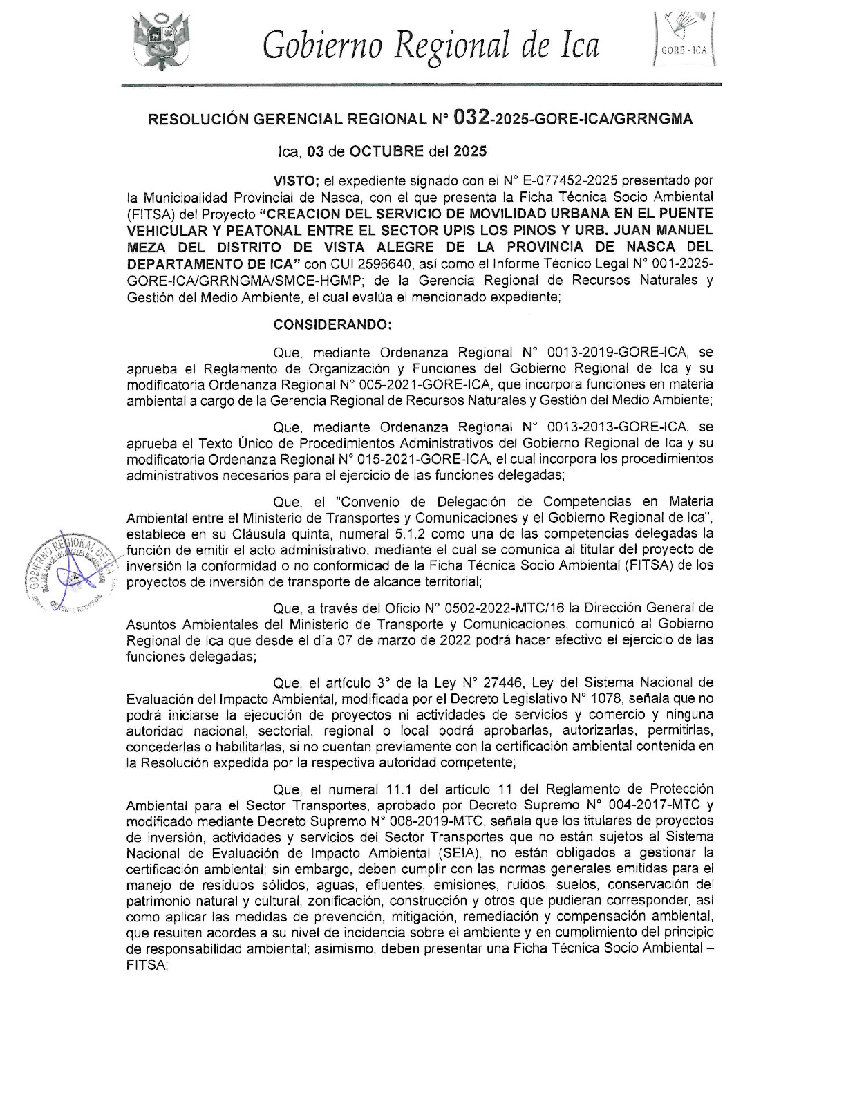 Conformidad a la ficha técnica socio ambiental FITSA del Proyecto CREACION DEL SERVICIO DE MOVILIDAD URBANA EN EL PUENTE VEHICULAR Y PEATONAL ENTRE EL SECTOR UPIS LOS PINOS Y URB. JUAN MANUEL MEZA DISTRITO DE VISTA ALEGRE DE LA PROVINCIA DE NASCA DEL DEPARTAMENTO DE ICA con CUI N° 2596640