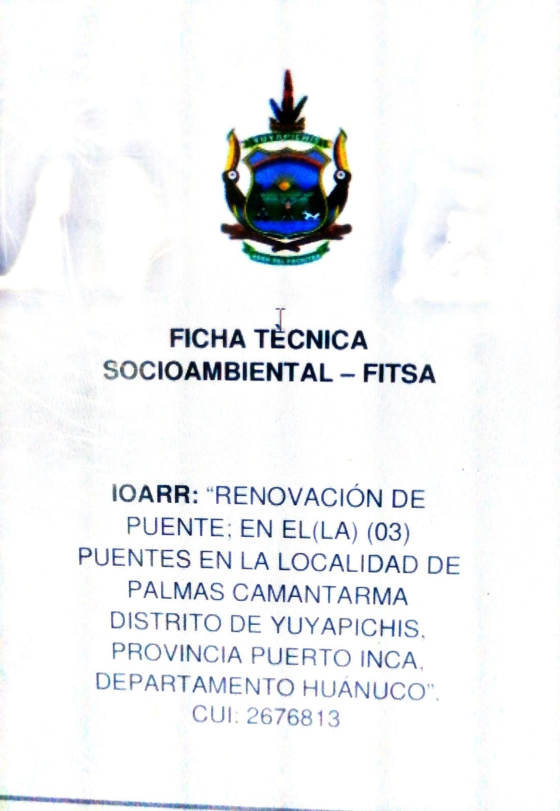 - Artículo primero otorgar la conformidad de la ficha técnica socioambiental FITSA para el proyecto, RENOVACION DE PUENTE; EN EL(LA) (03) PUENTES EN LA LOCALIDAD DE PALMAS CAMANTARMA, DISTRITO DE YUYAPICHIS, PROVINCIA PUERTO INCA, DEPARTAMENTO HUANUCO, CUI 2676813.