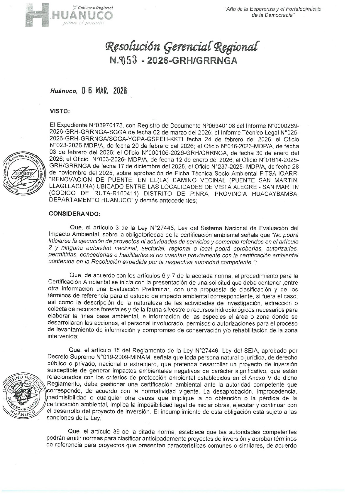 La Gerencia Regional de Recursos Naturales y Gestión Ambiental del Gobierno Regional Huánuco, mediante Resolución Gerencial Regional N.° 053-2026-GRH/GRRNGA, de fecha 06 de marzo de 2026, resuelve otorgar la conformidad a la Ficha Técnica Socio Ambiental (FITSA) correspondiente al proyecto: “Renovación de puente en el camino vecinal (Puente San Martín – Llagllacuna), ubicado entre las localidades de Vista Alegre y San Martín, distrito de Pinra, provincia de Huacaybamba, departamento de Huánuco”, identificado con CUI N.° 6972085. Este instrumento de gestión ambiental se sustenta en diversos informes técnicos y legales emitidos por las áreas competentes, la resolución se sustenta en las facultades conferidas por el Reglamento de Organización y Funciones del Gobierno Regional y el Reglamento de Protección Ambiental para el Sector Transportes, que establecen la competencia regional para evaluar y emitir conformidad de las FITSA para proyectos de transportes no sujetos al SEIA, verificándose que el estudio fue elaborado por profesionales habilitados conforme a la normativa sectorial.