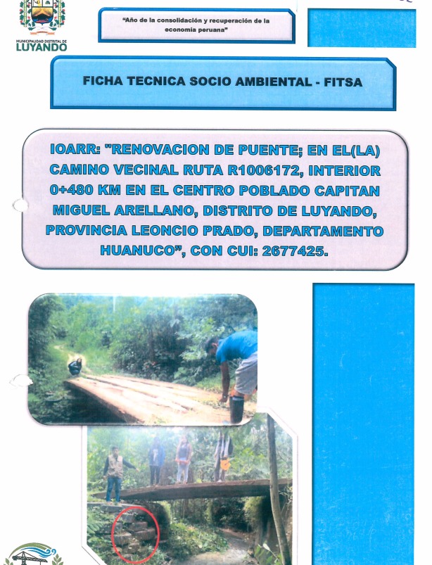 Mediante la Resolución Gerencial Regional N.º 232-2025-GRH/GRRNGA, de fecha 30 de diciembre de 2025, se otorga la conformidad a la Ficha Técnica Socio Ambiental (FITSA) para el proyecto: "Renovación de puente; en el camino vecinal ruta R1006172, interior 0+480 km en el Centro Poblado Capitán Miguel Arellano, Distrito de Luyando, Provincia Leoncio Prado, Huánuco", con CUI N°2677425. El proyecto, presentado por la Municipalidad Distrital de Luyando, fue evaluado favorablemente por la Gerencia Regional de Recursos Naturales y Gestión Ambiental del Gobierno Regional de Huánuco, en el marco de la normativa ambiental sectorial aplicable a proyectos de transporte no sujetos al SEIA.