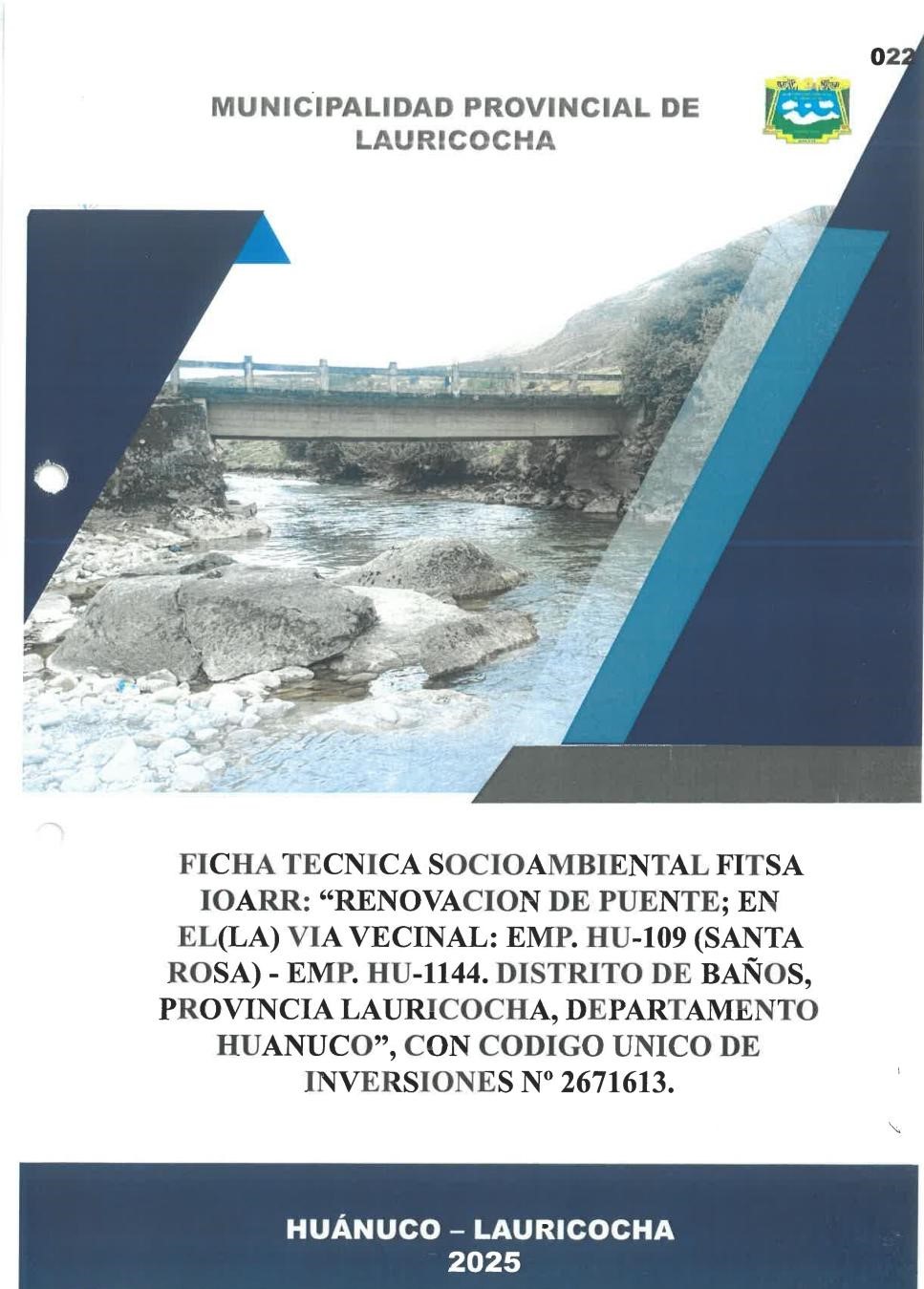 Renovación de Puente; en el(la) Vía Vecinal: Emp. Hu-109 (Santa Rosa) - Emp. Hu-1144. Distrito de Baños, Provincia Lauricocha, Departamento Huánuco “Con CUI N°2671613