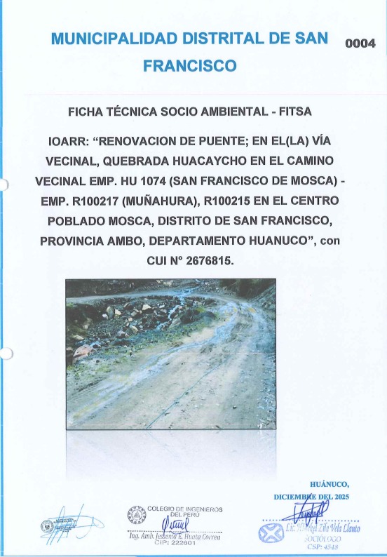 El presente documento describe los antecedentes de la Inversión de Optimización, Ampliación Marginal, Rehabilitación y Reposición (IOARR) para el proyecto "Renovación de puente; en la vía vecinal, Quebrada Huacaycho en el camino vecinal emp. HU 1074 (San Francisco de Mosca) - emp. R100217 (Muñahura), R100215 en el Centro Poblado Mosca, Distrito de San Francisco, Provincia Ambo, Huánuco" (CUI N° 2676815), gestionado por la Municipalidad Distrital de San Francisco.