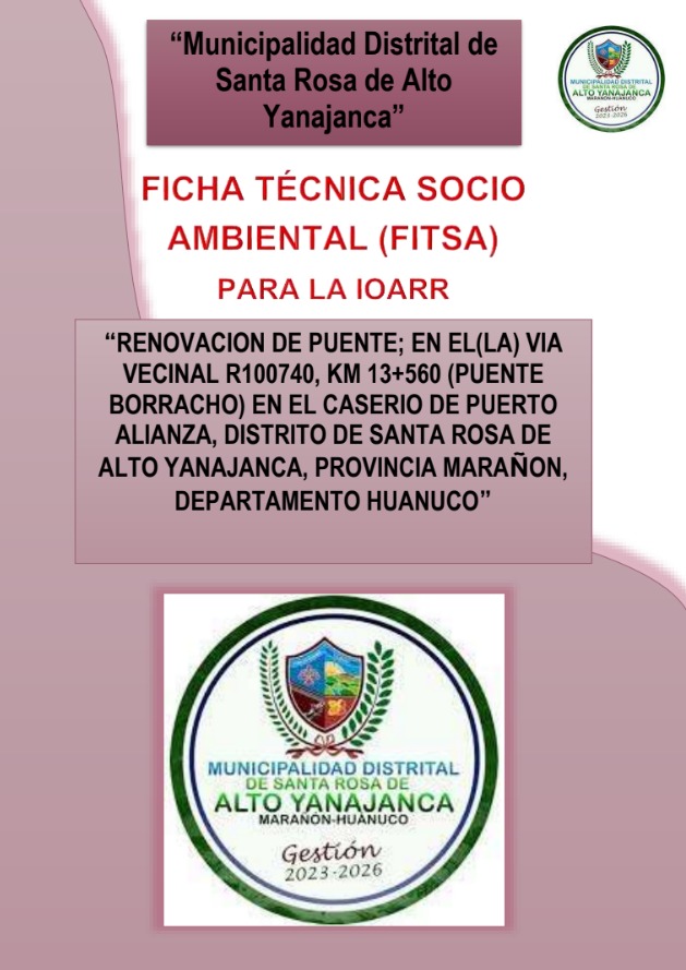 Los pobladores y vecinos de los diversos centros poblados, cercanos al área de influencia de la IOARR: “RENOVACION DE PUENTE; EN EL(LA) VIA VECINAL R100740, KM 13+560 (PUENTE BORRACHO) EN EL CASERIO DE PUERTO ALIANZA, DISTRITO DE SANTA ROSA DE ALTO YANAJANCA, PROVINCIA MARAÑON, DEPARTAMENTO HUANUCO”, han venido realizando gestiones para la priorización del presente IOARR. En las comunidades rurales localizadas en los