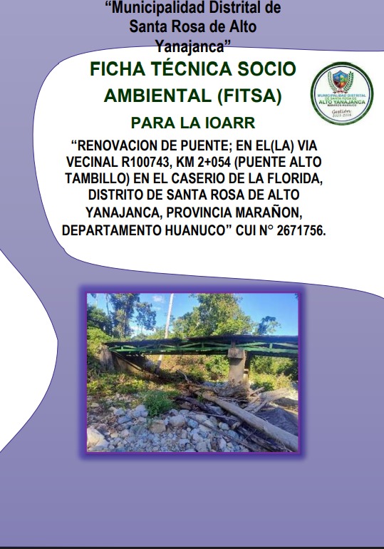 En respuesta a las gestiones de los pobladores, se ha priorizado la IOARR: “Renovación de Puente en la Vía Vecinal R100743, KM 2+054 (Puente Alto Tambillo)”, ubicado en el caserío La Florida, distrito de Santa Rosa de Alto Yanajanca, provincia de Marañón. Este proyecto busca superar las deficiencias críticas que actualmente dificultan el tránsito vehicular y peatonal, obstaculizando el transporte de productos agrícolas y el acceso a servicios y mercados, situaciones que generan pérdidas económicas recurrentes para las comunidades de la zona.