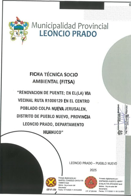 Mediante la Resolución Gerencial Regional N.º 236-2025-GRH/GRRNGA, de fecha 30 de diciembre de 2025, se otorga la conformidad ambiental a la Ficha Técnica Socio Ambiental (FITSA) para el proyecto "Renovación de puente; en la vía vecinal ruta R1006129 en el Centro Poblado Colpa Nueva Jerusalén, Distrito de Pueblo Nuevo, Provincia Leoncio Prado, Huánuco" con CUI N°2671656. La solicitud, presentada inicialmente por la Municipalidad Provincial de Leoncio Prado, fue evaluada positivamente por la Gerencia Regional de Recursos Naturales y Gestión Ambiental tras el cumplimiento satisfactorio de las observaciones técnicas formuladas durante la fase de revisión, en estricto apego a la normativa sectorial de transporte para proyectos no comprendidos en el SEIA.