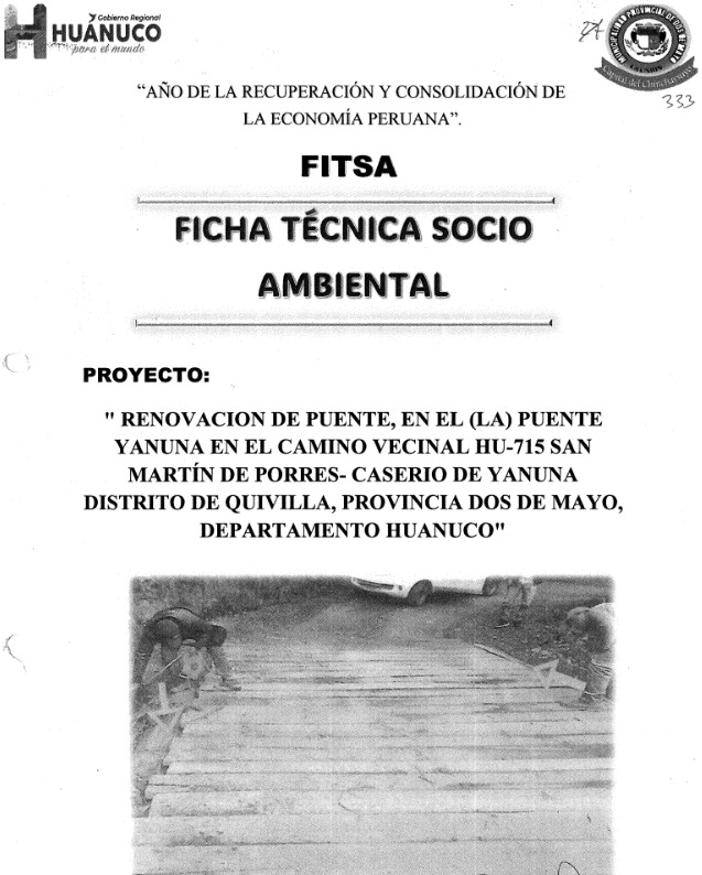 La Gerencia Regional de Recursos Naturales y Gestión Ambiental (GRRNGA) del Gobierno Regional de Huánuco ha otorgado la CONFORMIDAD a la Ficha Técnica Socio Ambiental (FITSA) para el proyecto "RENOVACIÓN DE PUENTE EN EL PUENTE YANUNA", ubicado en el camino vecinal HU-715, tramo San Martín de Porres - Caserío de Yanuna, en el distrito de Quivilla, provincia de Dos de Mayo. Esta aprobación se emite a favor de la Municipalidad Provincial de Dos de Mayo como titular del proyecto, tras un proceso de evaluación en el que se subsanaron las observaciones técnicas y legales formuladas por la Subgerencia de Gestión Ambiental.