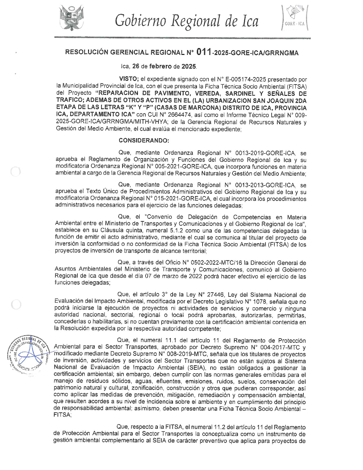 Conformidad a la ficha técnica socio ambiental FITSA del Proyecto REPARACION DE PAVIMENTO, VEREDA, SARDINEL Y SEÑALES DE TRÁFICO; ADEMÁS DE OTROS ACTIVOS EN EL(LA) URBANIZACION SAN JOAQUIN 2DA ETAPA DE LAS LETRAS "K" Y "P" (CASAS DE MARCONA) DISTRITO DE ICA, PROVINCIA ICA, DEPARTAMENTO ICA 2664474