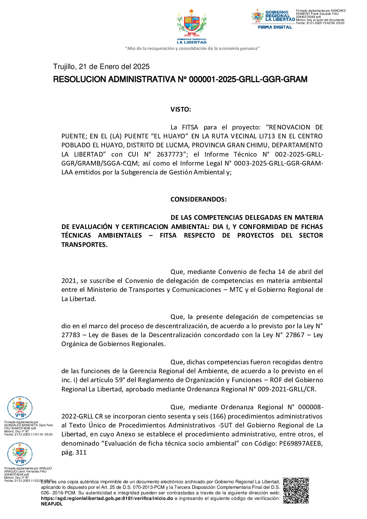La presente Resolución Administrativa otorga la CONFORMIDAD a la Ficha Técnica Socio Ambiental (FITSA) del proyecto “RENOVACION DE PUENTE; EN EL (LA) PUENTE “EL HUAYO” EN LA RUTA VECINAL LI713 EN EL CENTRO POBLADO EL HUAYO, DISTRITO DE LUCMA, PROVINCIA GRAN CHIMU, DEPARTAMENTO LA LIBERTAD” con CUI N° 2637773.