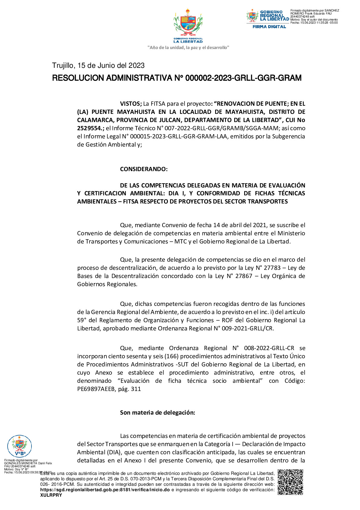 La Gerencia Regional del Ambiente, mediante RESOLUCION ADMINISTRATIVA N° 000002-2023-GRLL-GGR-GRAM, otorga la CONFORMIDAD a la Ficha Técnica Socio Ambiental (FITSA) del proyecto “RENOVACION DE PUENTE; EN EL (LA) PUENTE MAYAHUISTA EN LA LOCALIDAD DE MAYAHUISTA, DISTRITO DE CALAMARCA, PROVINCIA DE JULCAN, DEPARTAMENTO DE LA LIBERTAD” con CUI N° 2529554.