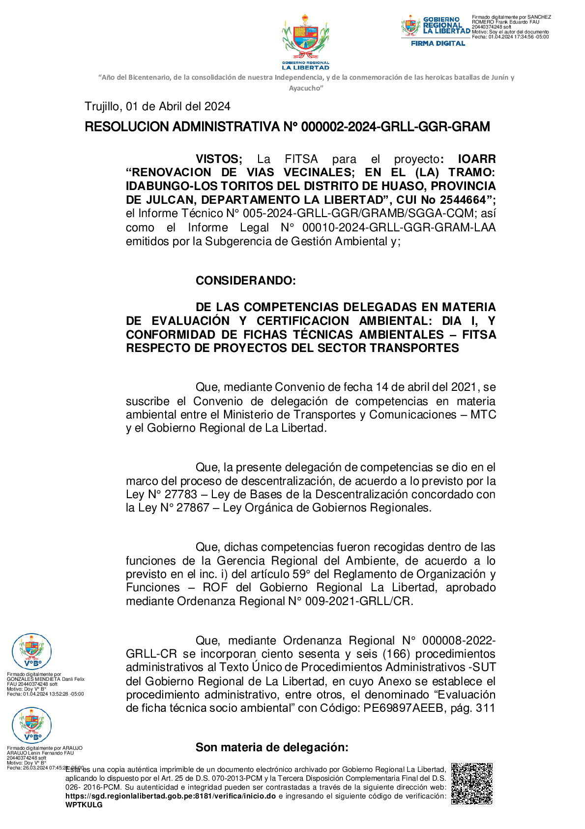 La Gerencia Regional del Ambiente, mediante RESOLUCION ADMINISTRATIVA N° 000002-2024-GRLL-GGR-GRAM, otorga la CONFORMIDAD a la Ficha Técnica Socio Ambiental (FITSA) del proyecto “RENOVACION DE VIAS VECINALES; EN EL (LA) TRAMO: IDABUNGO-LOS TORITOS DEL DISTRITO DE HUASO, PROVINCIA DE JULCAN, DEPARTAMENTO LA LIBERTAD” con CUI N° 2544664.
