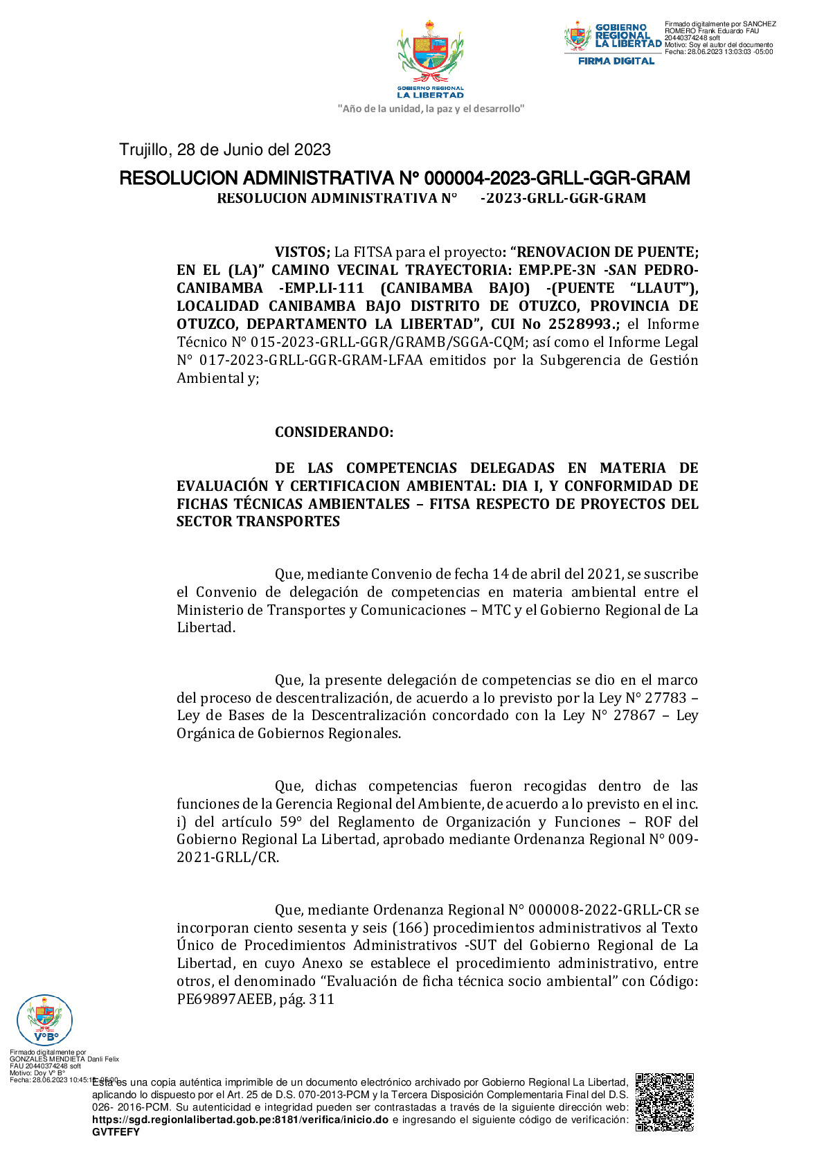 La Gerencia Regional del Ambiente, mediante RESOLUCION ADMINISTRATIVA N° 000004-2023-GRLL-GGR-GRAM, otorga la CONFORMIDAD a la Ficha Técnica Socio Ambiental (FITSA) del proyecto “RENOVACION DE PUENTE; EN EL (LA)” CAMINO VECINAL TRAYECTORIA: EMP.PE-3N -SAN PEDRO- CANIBAMBA -EMP.LI-111 (CANIBAMBA BAJO) -(PUENTE “LLAUT”), LOCALIDAD CANIBAMBA BAJO DISTRITO DE OTUZCO, PROVINCIA DE OTUZCO, DEPARTAMENTO LA LIBERTAD” con CUI N° 2528993.