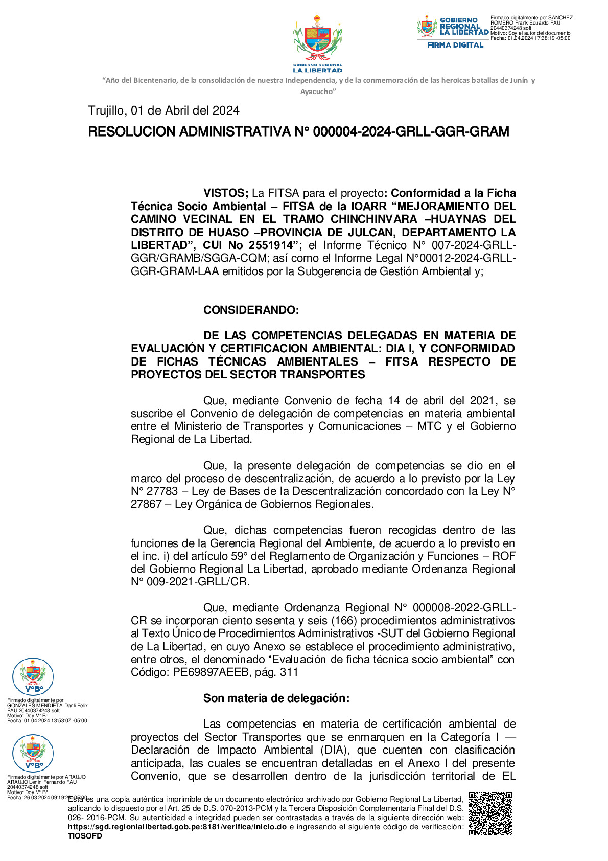 La Gerencia Regional del Ambiente, mediante RESOLUCION ADMINISTRATIVA N° 000004-2024-GRLL-GGR-GRAM, otorga la CONFORMIDAD a la Ficha Técnica Socio Ambiental (FITSA) del proyecto “MEJORAMIENTO DEL CAMINO VECINAL EN EL TRAMO CHINCHINVARA –HUAYNAS DEL DISTRITO DE HUASO –PROVINCIA DE JULCAN, DEPARTAMENTO LA LIBERTAD” con CUI N° 2551914.