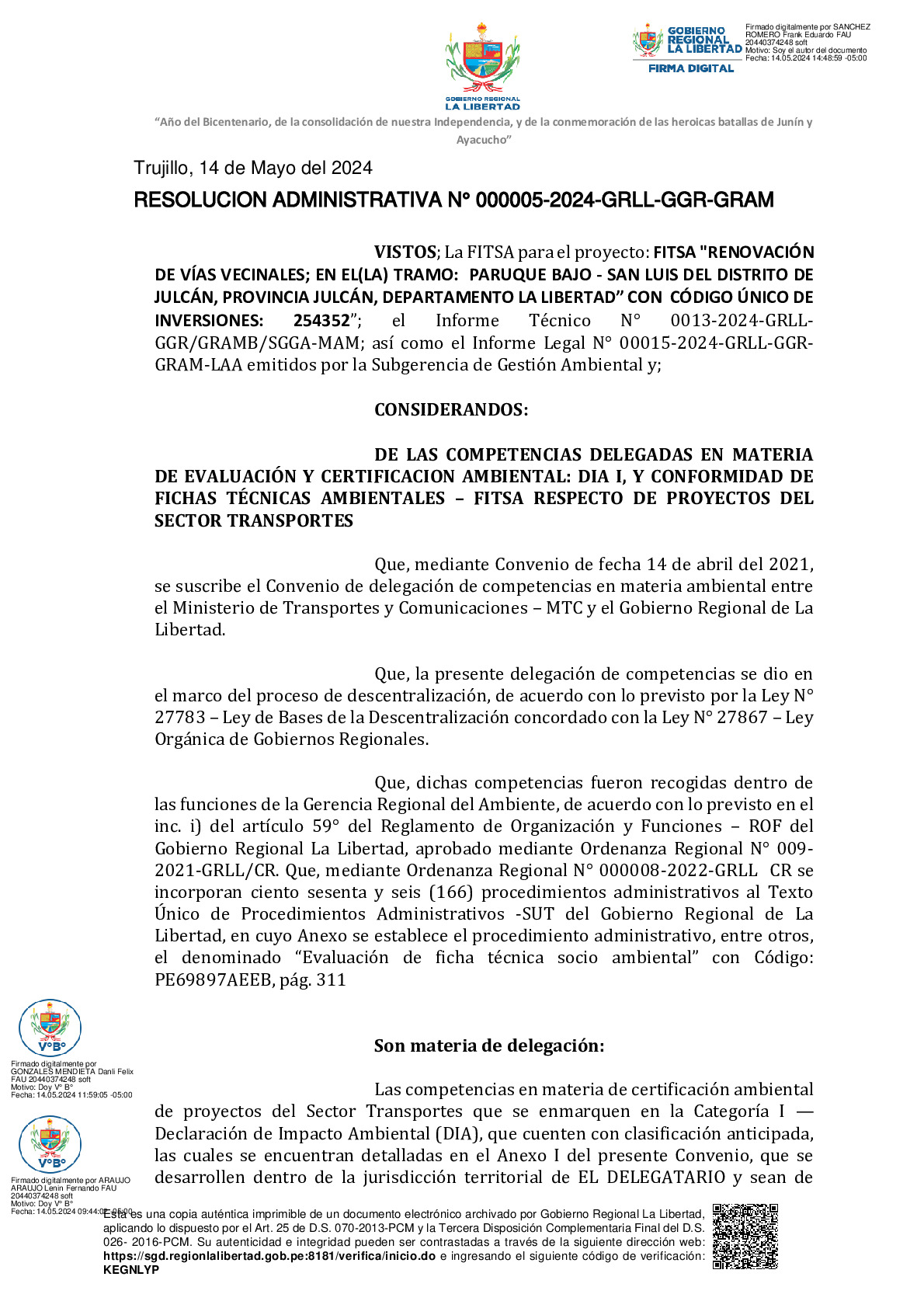 La Gerencia Regional del Ambiente, mediante RESOLUCION ADMINISTRATIVA N° 000005-2024-GRLL-GGR-GRAM, otorga la CONFORMIDAD a la Ficha Técnica Socio Ambiental (FITSA) del proyecto “RENOVACIÓN DE VÍAS VECINALES; EN EL(LA) TRAMO: PARUQUE BAJO - SAN LUIS DEL DISTRITO DE JULCÁN, PROVINCIA JULCÁN, DEPARTAMENTO LA LIBERTAD” con CUI N° 2543528.