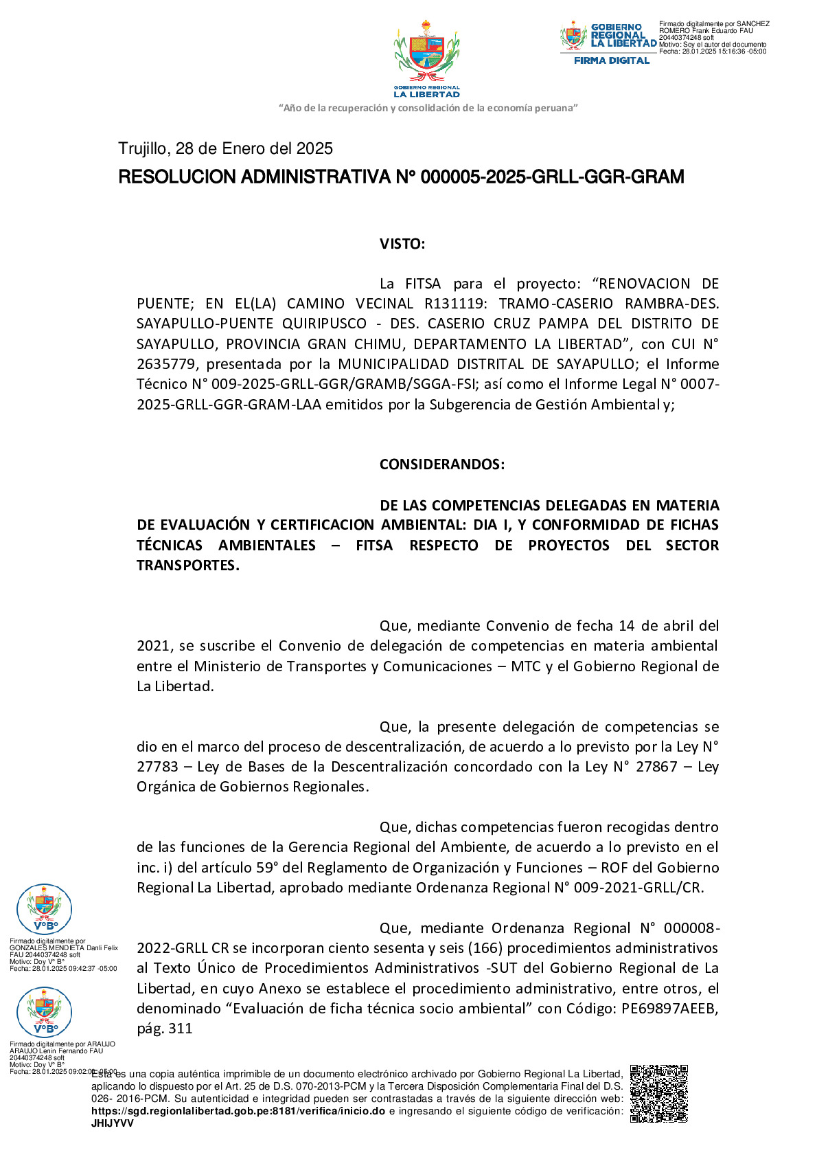 La Gerencia Regional del Ambiente, mediante RESOLUCION ADMINISTRATIVA N° 000005-2025-GRLL-GGR-GRAM, otorga la CONFORMIDAD a la Ficha Técnica Socio Ambiental (FITSA) del proyecto “RENOVACION DE PUENTE; EN EL(LA) CAMINO VECINAL R131119: TRAMO-CASERIO RAMBRA-DES. SAYAPULLO-PUENTE QUIRIPUSCO - DES. CASERIO CRUZ PAMPA DEL DISTRITO DE SAYAPULLO, PROVINCIA GRAN CHIMU, DEPARTAMENTO LA LIBERTAD” con CUI N° 2635779.