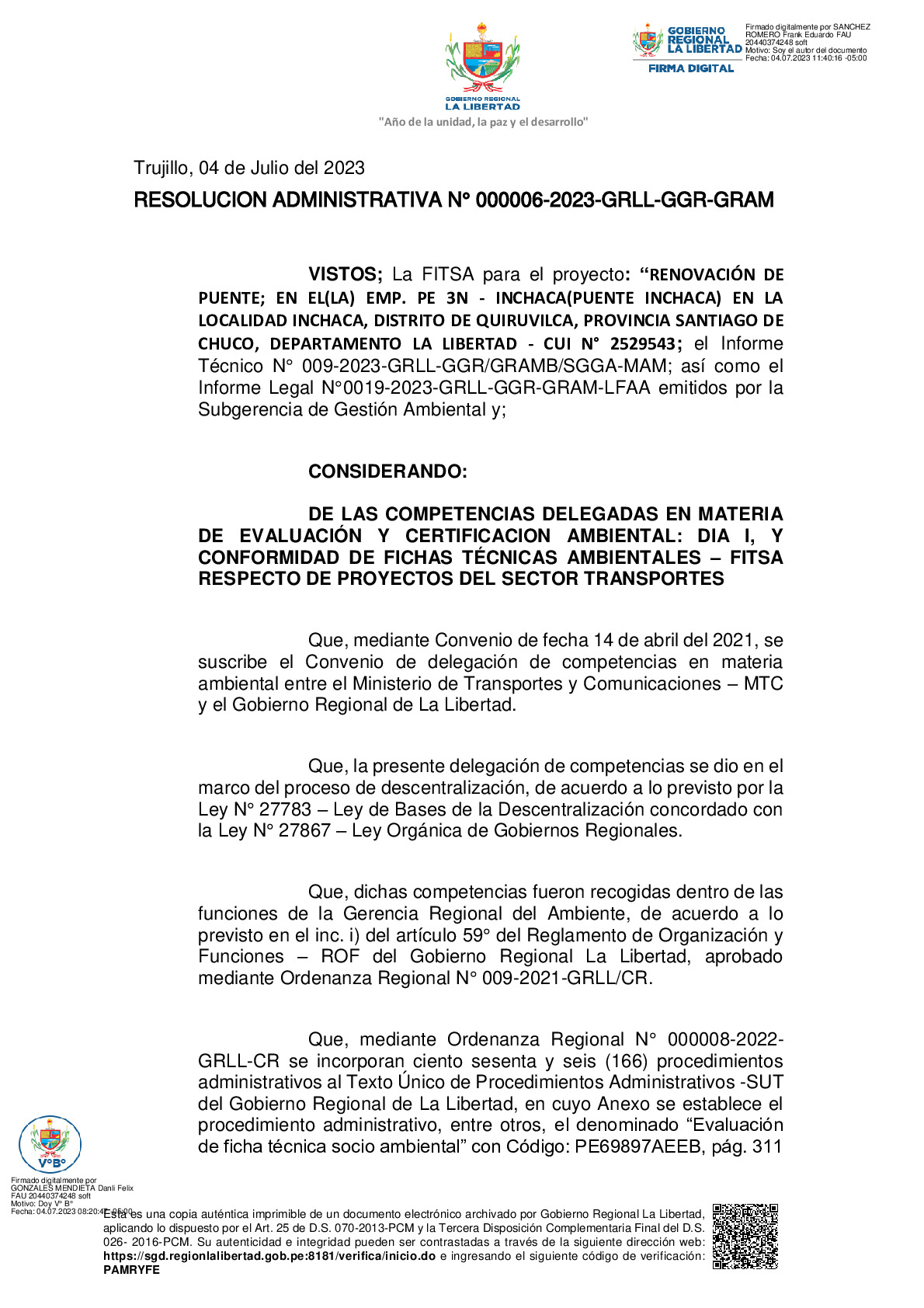 La Gerencia Regional del Ambiente, mediante RESOLUCION ADMINISTRATIVA N° 000006-2023-GRLL-GGR-GRAM, otorga la CONFORMIDAD a la Ficha Técnica Socio Ambiental (FITSA) del proyecto “RENOVACIÓN DE PUENTE; EN EL(LA) EMP. PE 3N - INCHACA(PUENTE INCHACA) EN LA LOCALIDAD INCHACA, DISTRITO DE QUIRUVILCA, PROVINCIA SANTIAGO DE CHUCO, DEPARTAMENTO LA LIBERTAD” con CUI N° 2529543.