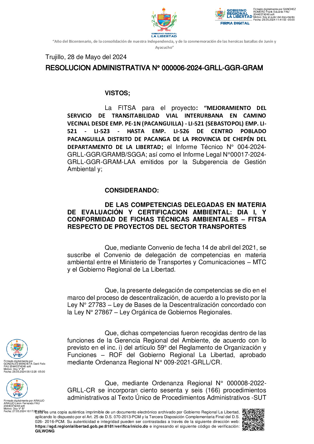 La Gerencia Regional del Ambiente, mediante RESOLUCION ADMINISTRATIVA N° 000006-2024-GRLL-GGR-GRAM, otorga la CONFORMIDAD a la Ficha Técnica Socio Ambiental (FITSA) del proyecto “MEJORAMIENTO DEL SERVICIO DE TRANSITABILIDAD VIAL INTERURBANA EN CAMINO VECINAL DESDE EMP. PE-1N (PACANGUILLA) - LI-521 (SEBASTOPOL) - EMP. LI-521 - LI-523 - HASTA EMP. LI-526 DE CENTRO POBLADO PACANGUILLA DISTRITO DE PACANGA DE LA PROVINCIA DE CHEPEN DEL DEPARTAMENTO DE LA LIBERTAD” con CUI N° 2629718.