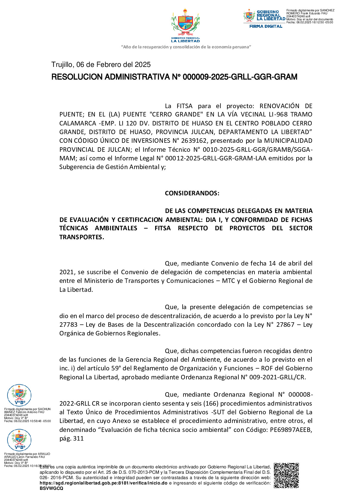 La Gerencia Regional del Ambiente, mediante RESOLUCION ADMINISTRATIVA N° 000009-2025-GRLL-GGR-GRAM, otorga la CONFORMIDAD a la Ficha Técnica Socio Ambiental (FITSA) del proyecto “RENOVACIÓN DE PUENTE; EN EL (LA) PUENTE "CERRO GRANDE" EN LA VÍA VECINAL LI-968 TRAMO CALAMARCA -EMP. LI 120 DV. DISTRITO DE HUASO EN EL CENTRO POBLADO CERRO GRANDE, DISTRITO DE HUASO, PROVINCIA JULCAN, DEPARTAMENTO LA LIBERTAD” con CUI N° 2639162.