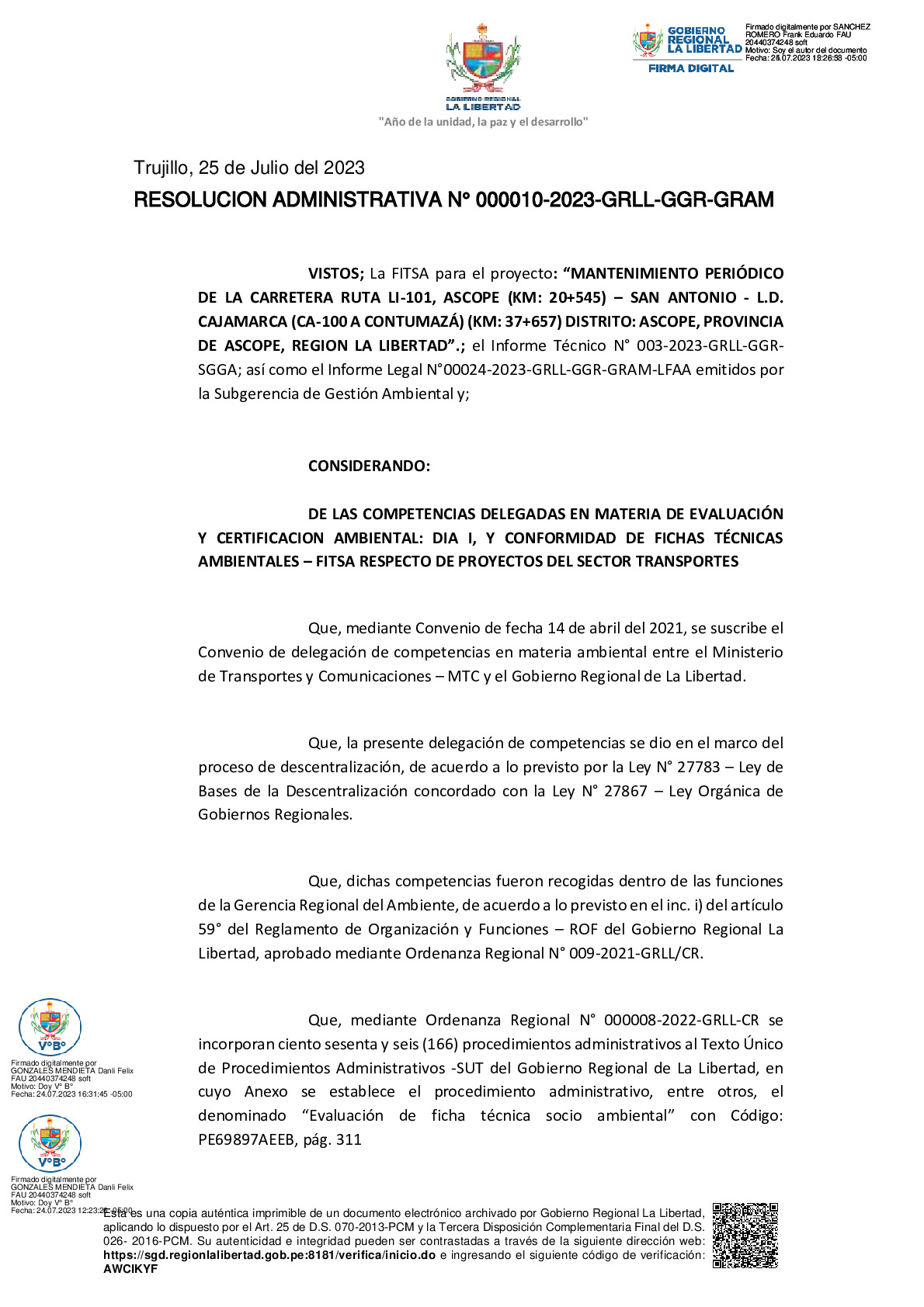 La Gerencia Regional del Ambiente, mediante RESOLUCION ADMINISTRATIVA N° 000010-2023-GRLL-GGR-GRAM, otorga la CONFORMIDAD a la Ficha Técnica Socio Ambiental (FITSA) del proyecto “MANTENIMIENTO PERIÓDICO DE LA CARRETERA RUTA LI-101, ASCOPE (KM: 20+545) – SAN ANTONIO - L.D. CAJAMARCA (CA-100 A CONTUMAZÁ) (KM: 37+657) DISTRITO: ASCOPE, PROVINCIA DE ASCOPE, REGION LA LIBERTAD”.