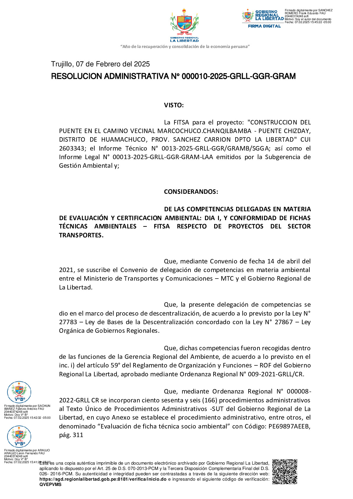 La Gerencia Regional del Ambiente, mediante RESOLUCION ADMINISTRATIVA N° 000010-2025-GRLL-GGR-GRAM, otorga la CONFORMIDAD a la Ficha Técnica Socio Ambiental (FITSA) del proyecto “CONSTRUCCION DEL PUENTE EN EL CAMINO VECINAL MARCOCHUCO.CHANQILBAMBA - PUENTE CHIZDAY, DISTRITO DE HUAMACHUCO, PROV. SANCHEZ CARRION DPTO LA LIBERTAD” con CUI N° 2603343.