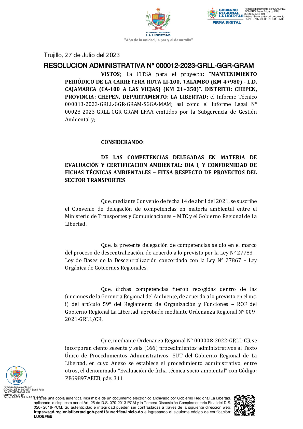 La Gerencia Regional del Ambiente, mediante RESOLUCION ADMINISTRATIVA N° 000012-2023-GRLL-GGR-GRAM, otorga la CONFORMIDAD a la Ficha Técnica Socio Ambiental (FITSA) del proyecto “MANTENIMIENTO PERIÓDICO DE LA CARRETERA RUTA LI-100, TALAMBO (KM 4+980) - L.D. CAJAMARCA (CA-100 A LAS VIEJAS) (KM 21+350)”. DISTRITO: CHEPEN, PROVINCIA: CHEPEN, DEPARTAMENTO: LA LIBERTAD".