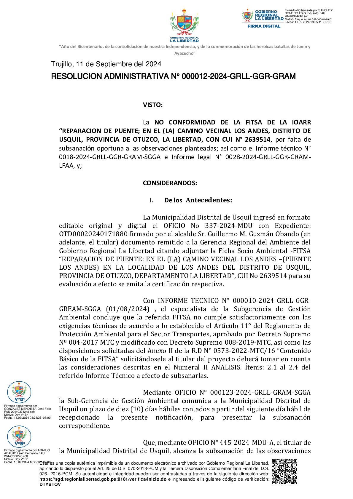 La Gerencia Regional del Ambiente, mediante RESOLUCION ADMINISTRATIVA N° 000012-2024-GRLL-GGR-GRAM, declara la NO CONFORMIDAD a la Ficha Técnica Socio Ambiental (FITSA) del proyecto “REPARACION DE PUENTE, EN EL (LA) CAMINO VECINAL LOS ANDES LI 808 (PUENTE LOS ANDES) EN LA LOCALIDAD DE LOS ANDES DEL DISTRITO DE USQUIL, PROVINCIA OTUZCO, DEPARTAMENTO LA LIBERTAD” con CUI N° 2639514.