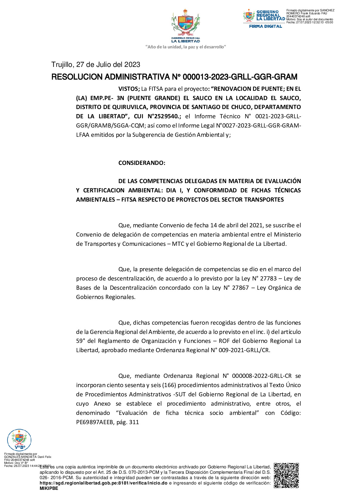 La Gerencia Regional del Ambiente, mediante RESOLUCION ADMINISTRATIVA N° 000013-2023-GRLL-GGR-GRAM, otorga la CONFORMIDAD a la Ficha Técnica Socio Ambiental (FITSA) del proyecto “RENOVACION DE PUENTE; EN EL (LA) EMP.PE- 3N (PUENTE GRANDE) EL SAUCO EN LA LOCALIDAD EL SAUCO, DISTRITO DE QUIRUVILCA, PROVINCIA DE SANTIAGO DE CHUCO, DEPARTAMENTO DE LA LIBERTAD” con CUI N° 2529540.