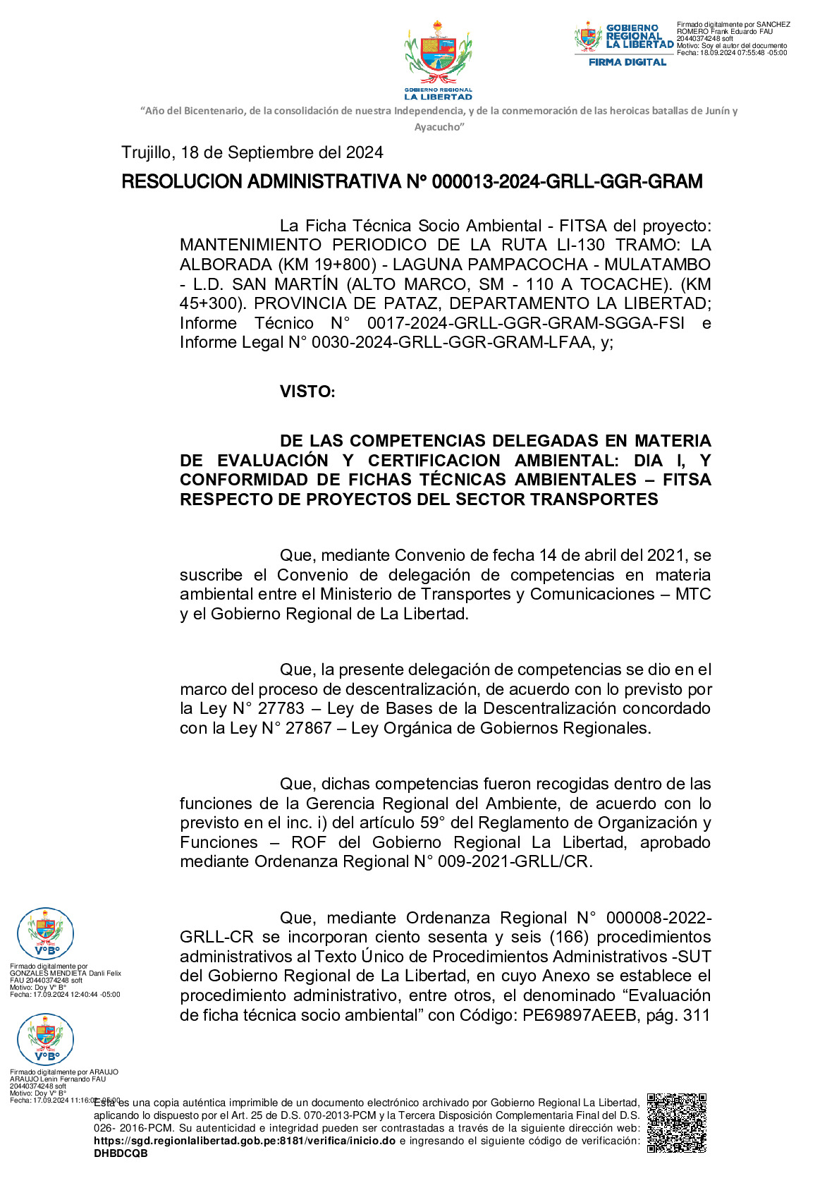 La Gerencia Regional del Ambiente, mediante RESOLUCION ADMINISTRATIVA N° 000013-2024-GRLL-GGR-GRAM, otorga la CONFORMIDAD a la Ficha Técnica Socio Ambiental (FITSA) del proyecto “MANTENIMIENTO PERIODICO DE LA RUTA LI-130 TRAMO: LA ALBORADA (KM 19+800) - LAGUNA PAMPACOCHA - MULATAMBO - L.D. SAN MARTÍN (ALTO MARCO, SM - 110 A TOCACHE). (KM 45+300). PROVINCIA DE PATAZ, DEPARTAMENTO LA LIBERTAD”.