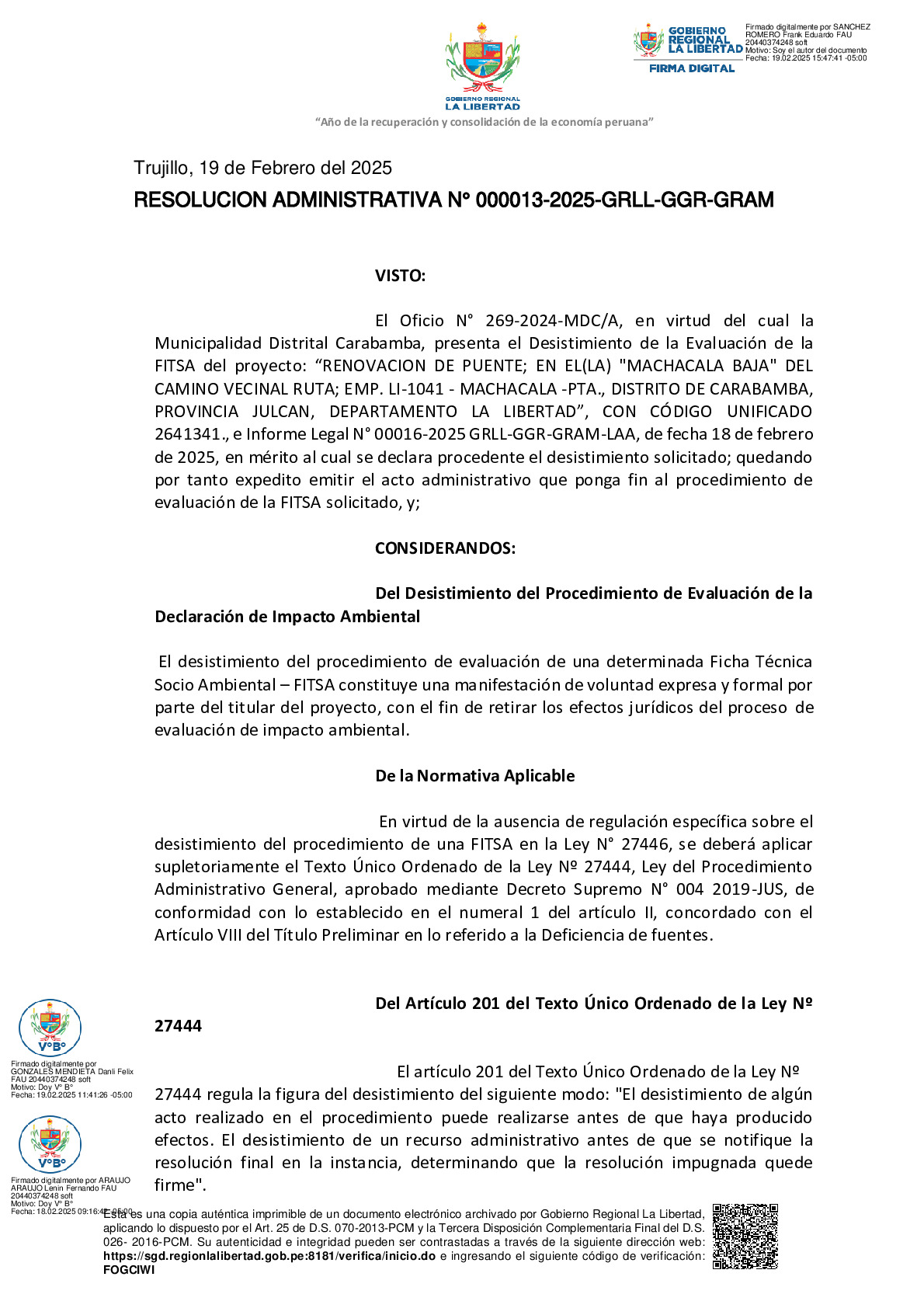 La Gerencia Regional del Ambiente, mediante RESOLUCION ADMINISTRATIVA N° 000013-2025-GRLL-GGR-GRAM, declara procedente el DESISTIMIENTO solicitado por la Municipalidad Distrital Carabamba a la Ficha Técnica Socio Ambiental (FITSA) del proyecto “RENOVACION DE PUENTE; EN EL(LA) "MACHACALA BAJA" DEL CAMINO VECINAL RUTA; EMP. LI-1041 - MACHACALA -PTA., DISTRITO DE CARABAMBA, PROVINCIA JULCAN, DEPARTAMENTO LA LIBERTAD” con CUI N° 2641341.